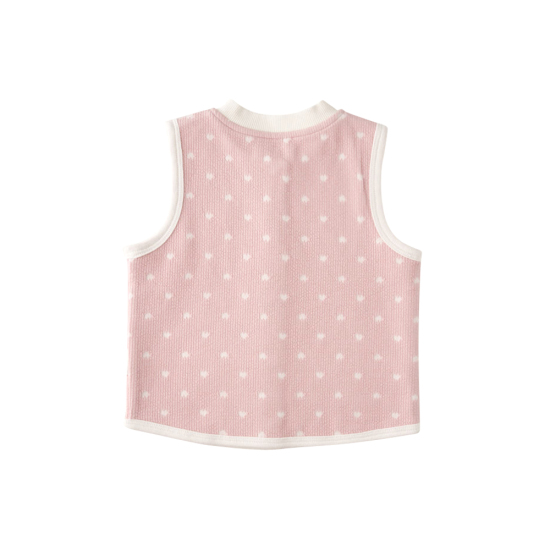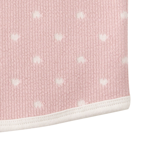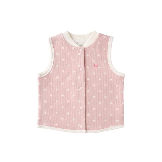 피치 컬러의 골지 저지 원단에 하트 모양의 자가드 조직을 더해 귀여운 무드를 구현하였습 니다.
