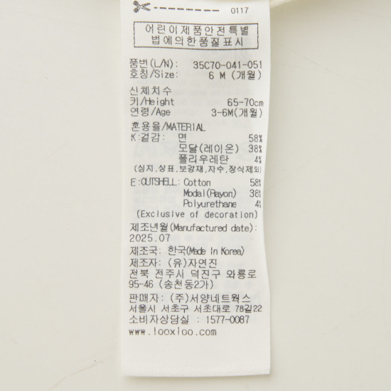 소 재......[모자:겉감-면58%,모달(레이온)38%,폴리우레탄4% / 안 감-면60%,모달(레이온)40%] [우주복:겉감-면58%,모달(레 이온)38%,폴리우레탄4%]