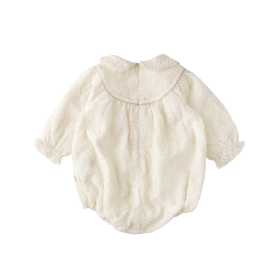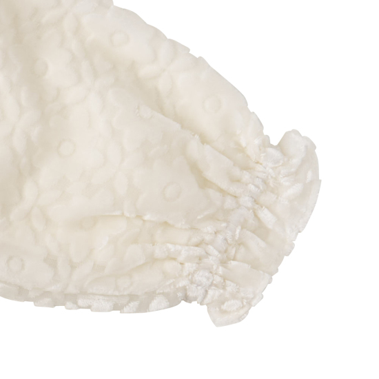 퓨어한 크림 컬러의 샤를뮤 스페셜 벨벳 바디슈트 보넷 SET입니다. 부드러운 플라워 벨벳 번아웃 레이스를 사용하여 보온성을 높이고 골드 자수와 골드 파이핑을 활용하여 고급스러움을 더해준 아이템입니다.