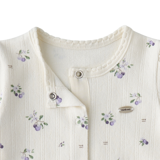 코튼원사를 신축성이 좋은 후라이스스판 조직에 아일렛 자가드를 넣어 제직한 원단을 사용한 내의입니다. 자가드 조직이 통기성을 높여 피부가 예민한 아기들에게 편안하고 시원한 착용감을 주며 스판사가 들어있어 신축성이 매우 좋습니다. 열매플라워패턴에 고급스러운 펜던트를 매칭해준 디자인으로 아기들에게 선물용으로 구성하기 좋은 아이템입니다.