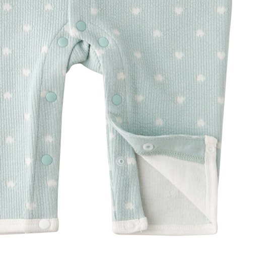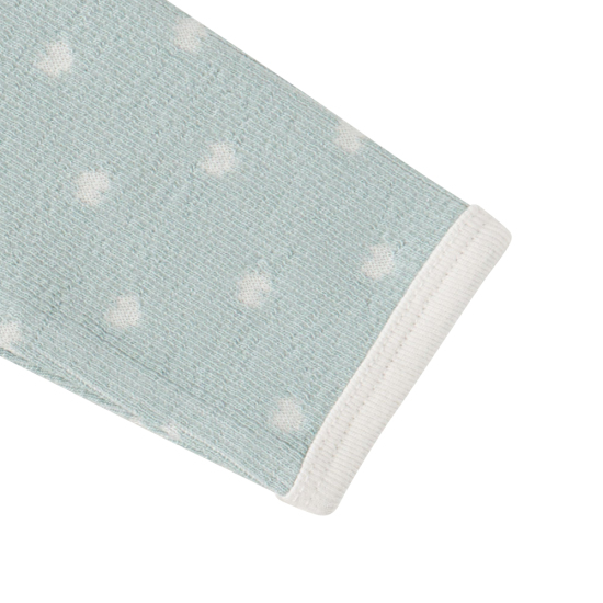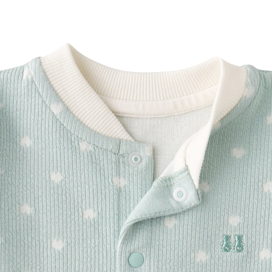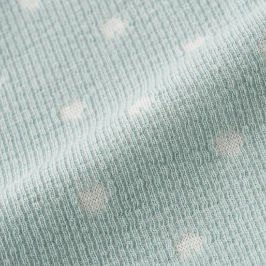 민트 컬러의 골지 저지 원단에 하트 모양의 자가드 조직을 더해 귀여운 무드를 구현하였습 니다.