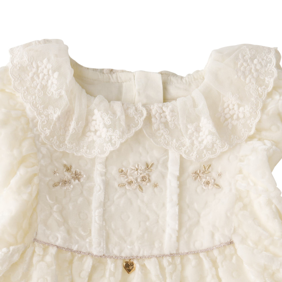 퓨어한 크림 컬러의 샤를뮤 스페셜 벨벳 드레스입니다. 부드러운 플라워 벨벳 번아웃 레이스를 사용하여 보온성을 높이고 러블리한 레이스 테이프로 포인트를 주었습니다. 골드 플라워 자수와 레이스 카라를 활용하여 고급스러움을 더해준 아이템입니다.