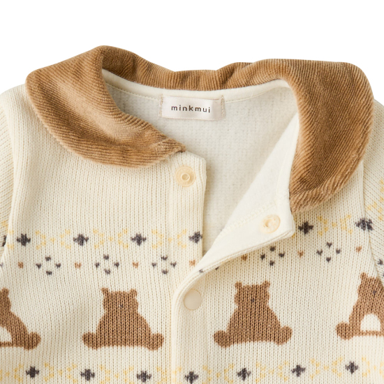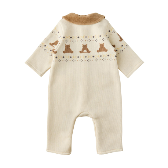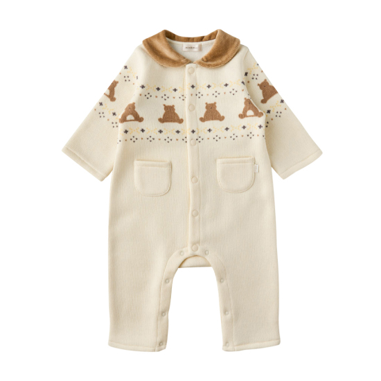 소프트한 크림 컬러의 베베자가드SET우주복입니다. 부드럽고 포근한 면 기모 자가드 소재를 사용하였으며 곰돌이 패턴 자가드로 포인트를 주었습니다. 스판성 있고 부드러운 골 벨로아 소재의 챙 보넷과 세트로 구성하여 귀여움을 더한 아이템입니다.