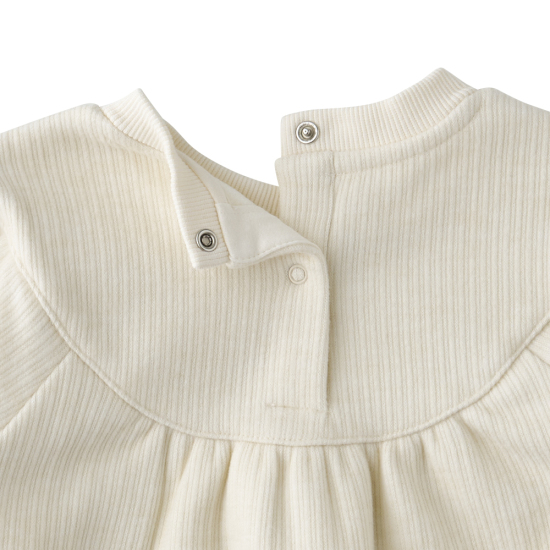 소프트한 크림 컬러의 변형 골지 맨투맨입니다. 고급스러운 골드 파이핑과 체리 자 수로 포인트를 주어 러블리한 느낌을 더해주었으며, 퓨어와이드골팬츠와 세트로 연출이 가능한 아이템입니다.