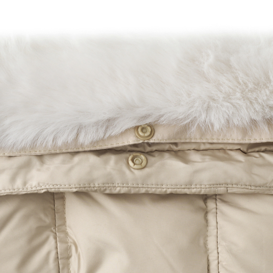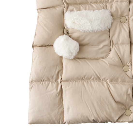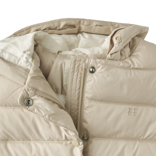 퓨어한 베이지 컬러의 롱다운 점퍼로 앞판의 프린세스 라인 절개가 러블리한 핏을 연출해 줍니다. 포켓에는 퍼 배색과 방울 퍼 장식을 더해 귀여운 포인트를 주었으며 부드러운 밸보아 안감으로 보온성을 높인 아이템입니다.
