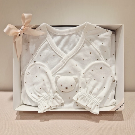 밍크뮤 B.I 시리즈 라인으로 80수 실을 양면으로 직조하여 제작한 원단으로 사용된 배내저고리,손싸개세트입니다.