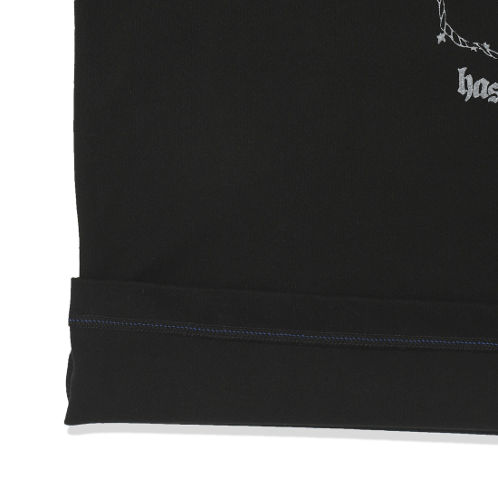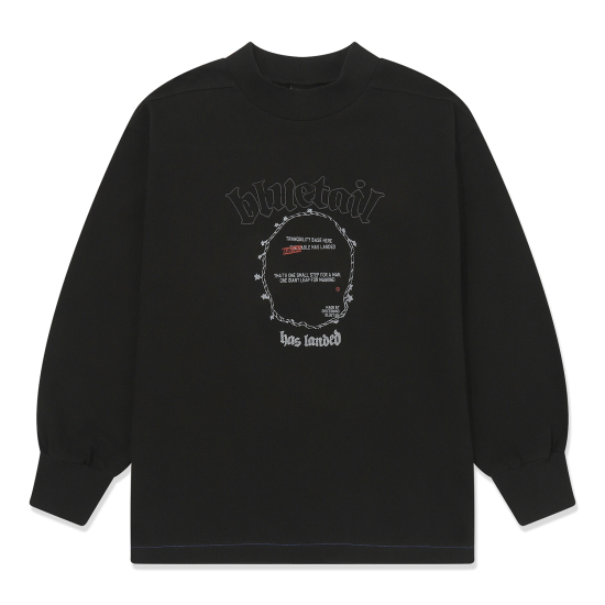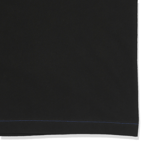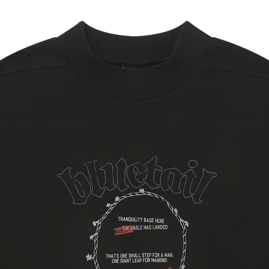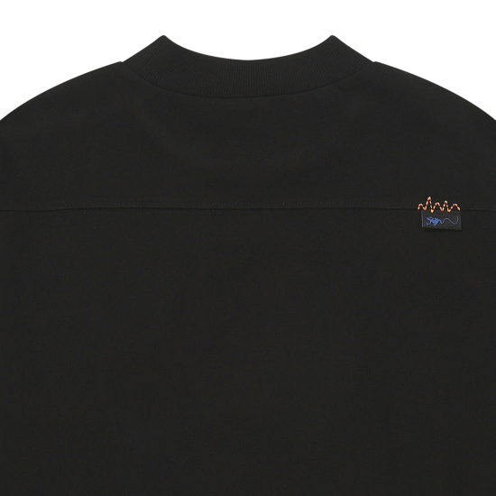 시크한 블랙 컬러 기모 티셔츠입니다. 상동과 어깨가 넓지 않은 세미 슬림핏으로 제안하여 레이어드에도 용이한 아이템입니다. 살짝 올라온 넥으로 제안하여 따뜻하게 감싸며 답답하지 않게 제안했습니다. 밑단에 블루 컬러 스티치로 포인트를 주었습니다. 스트릿 감성을 살려 임팩트 있는 빈티지한 레터링나염으로 컬러 포인트를 주었습니다.
