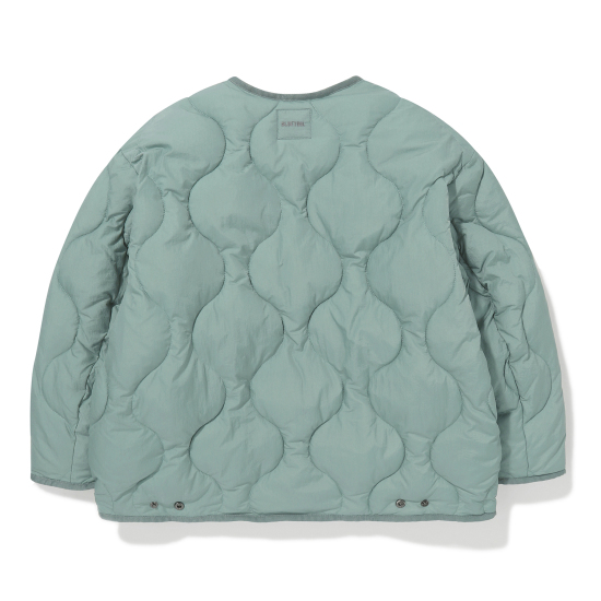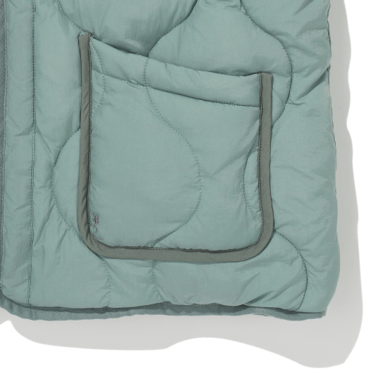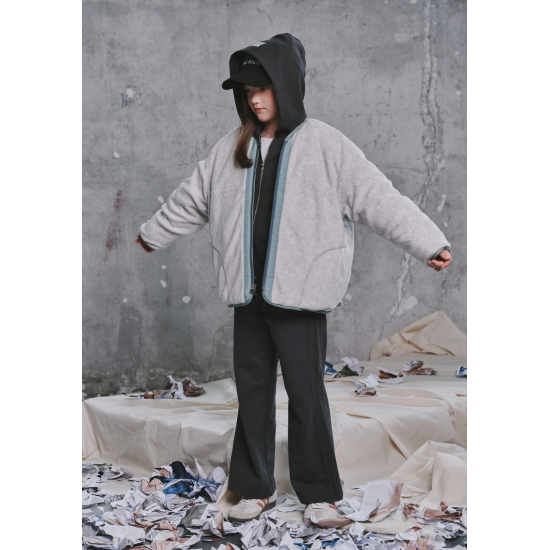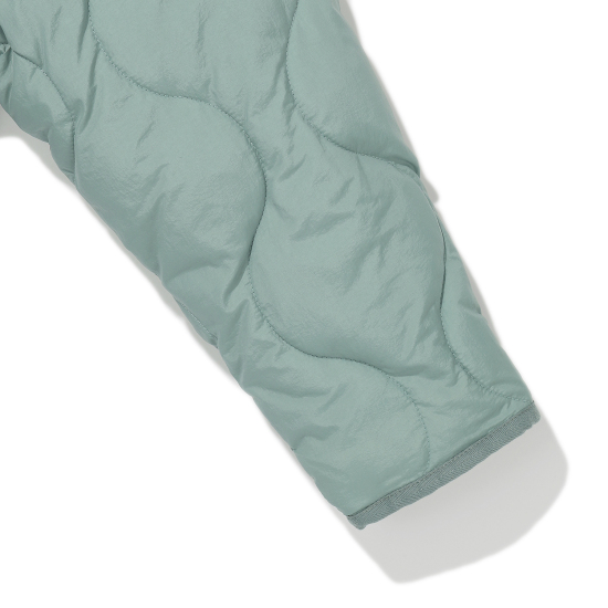 민트 컬러 퀼팅 원단과 라이트 그레이 플리스 안감으로 리버시블 점퍼입니다. 플리스쪽에 포켓을 주어 뒤집어 착용할 수 있으며, 뒷판 밑단 스냅으로 아래를 모아 귀여운 실루엣으로도 스타일링이 가능한 상품입니다. 포켓을 둘러싼 원단과 지퍼를 세련된 컬러 조합으로 포인트 주었습니다.