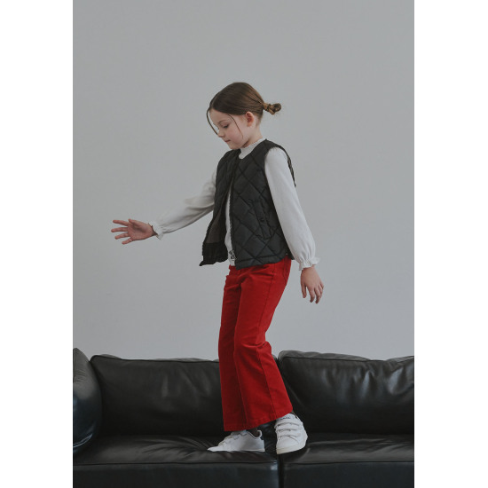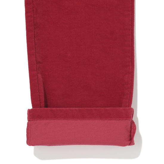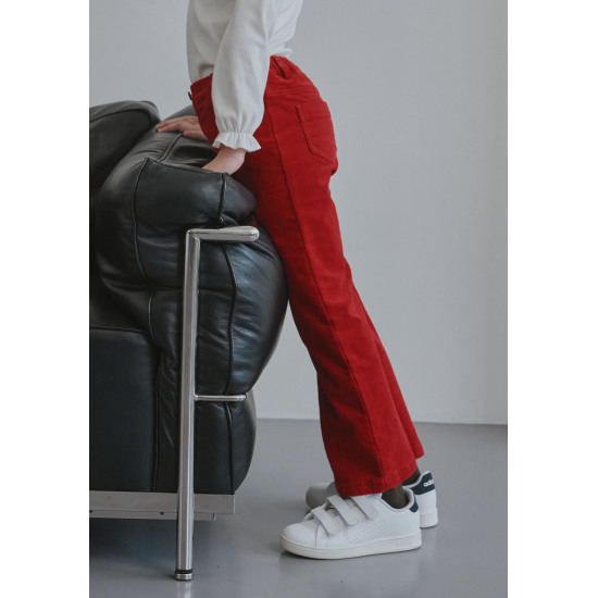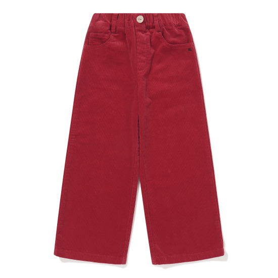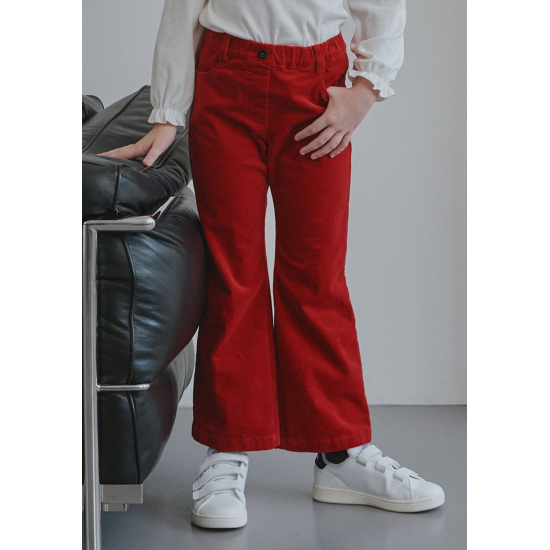 선명한 컬러가 돋보이는 레드 컬러의 코듀로이 일자 팬츠입니다. 미니멀하게 떨어지는 일자 라인이 시크하고 고급스러운 이미지를 연출해줍니다. 아이보리 컬러 풀오버, 블랙 퍼 코트와 함께 입어 시크한 여아 스타일링을 제안하거나, 라이트 그레이 컬러의 풀오버와 함께 입고 퀼팅 베스트와 스타일링하여 세련된 분위기의 캐주얼한 스타일링을 제안할 수 있습니다.