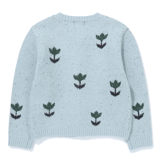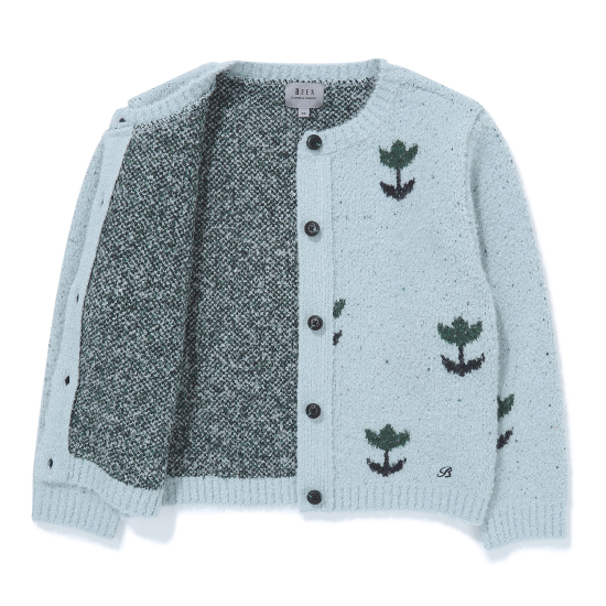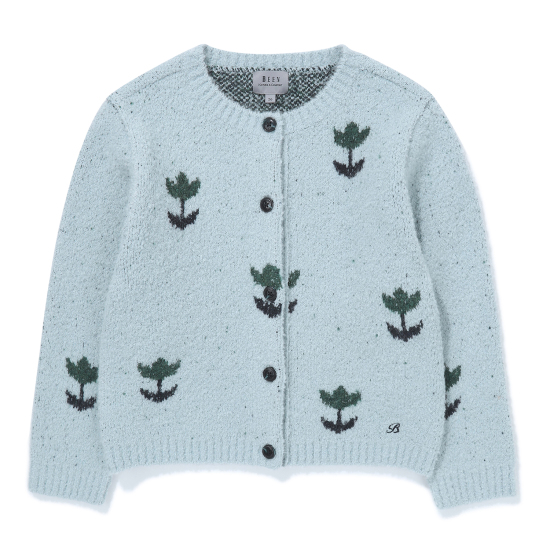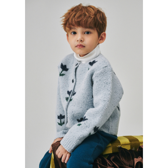 사랑스러운 컬러 조합이 돋보이는 스카이 블루, 그린, 네이비 컬러의 자카드 니트 가디건입니다. 미니멀한 플라워 모티브가 귀여운 분위기를 연출해주며, 알파카 혼방 소재의 따뜻하고 부드러운 촉감과 뛰_어난 보온성이 좋은 아이템입니다. 골지 기모 소재의 쫄바지 또는 그린 컬러, 민트 컬러의 기모 져지 팬츠와 함께 매치하여 귀엽고 편안한 스타일링을 제안할 수 있습니다.