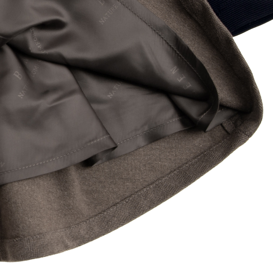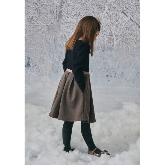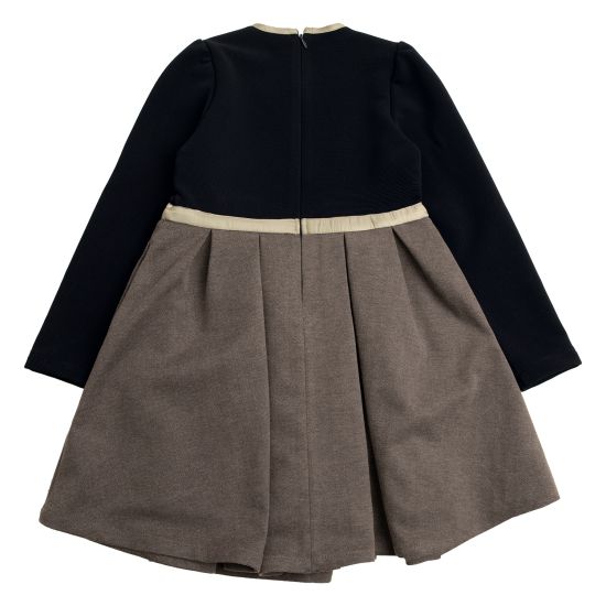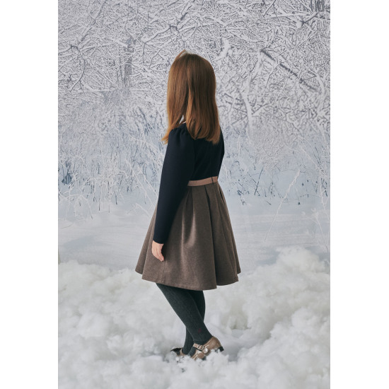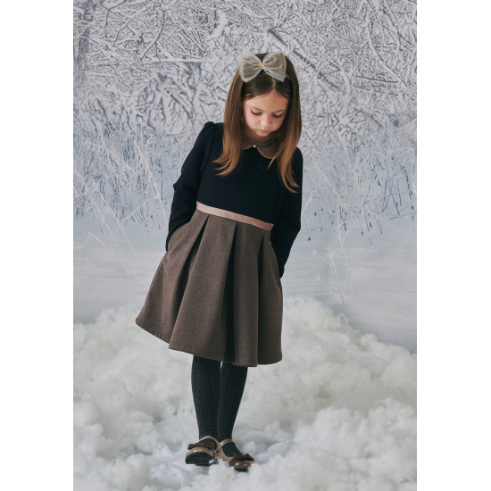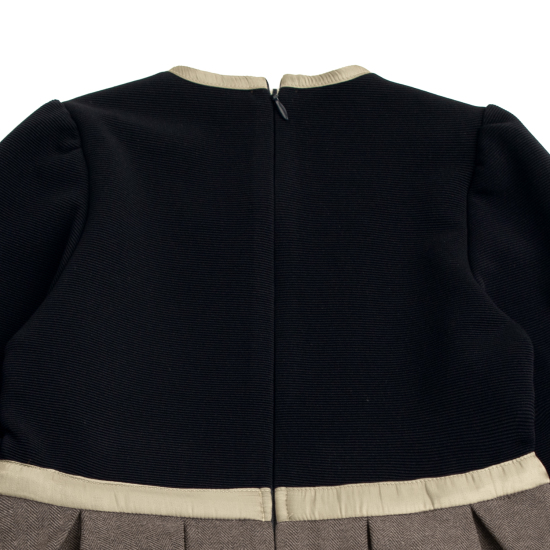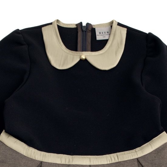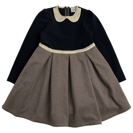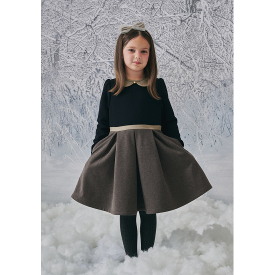 골지 변형 네이비 컬러 져지 소재와 브라운 컬러의 헤링본 소재 배색 디자인이 유니크한 스타일의 원피스입니다. 무릎까지 내려오는 여유로운 기장감과 맞주름 디테일로 풍성한 실루엣을 연출하며, 사랑스러운 볼륨감을 더해줍니다. 네크라인에는 볼륨감을 더해주어 포근한 터치감을 주었고, 허리 부분과 네크라인에 글로시한 소재를 배색으로 사용해 럭셔리한 은은한 화려함과 귀여운 분위기를 동시에 느낄 수 있습니다.