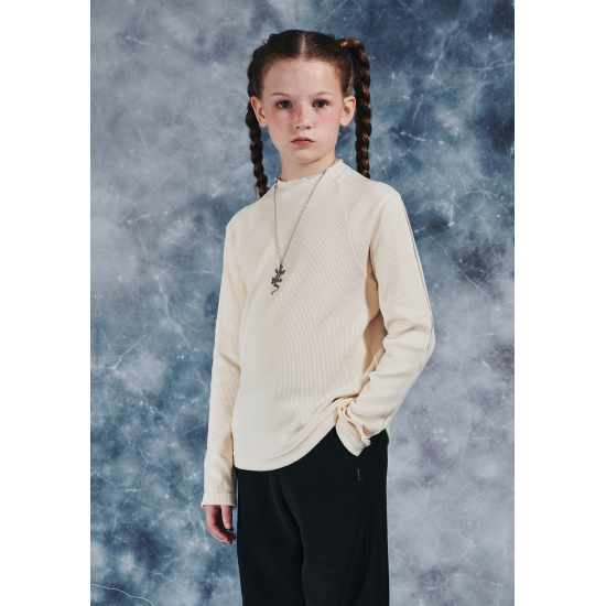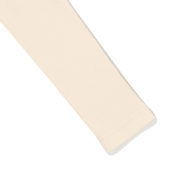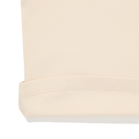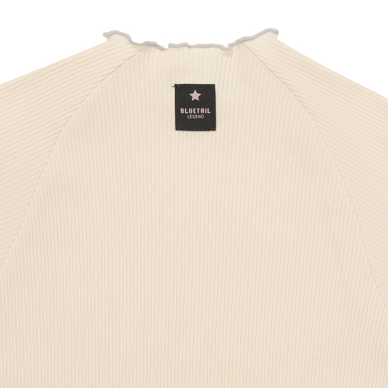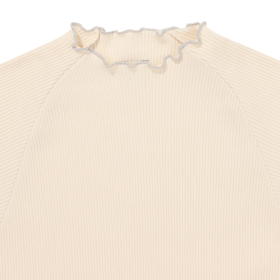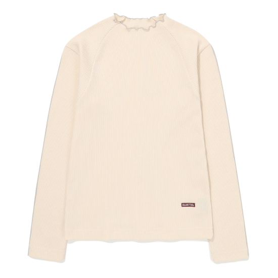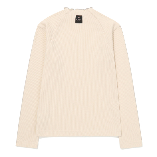 아이보리 컬러 슬림핏 골지 프릴 긴팔 티셔츠입니다. 적당히 슬림하게 떨어지는 실루엣으로 날씬해보이는 효과가 있으며 약간 올라온 넥과 긴 소매로 레이어드하기에도 용이해 다양한 스타일링을 할 수 있는 상품입니다. 작지만 임팩트있는 자수 와펜과 뒷넥 아래 라벨로 컬러 포인트 주었습니다.