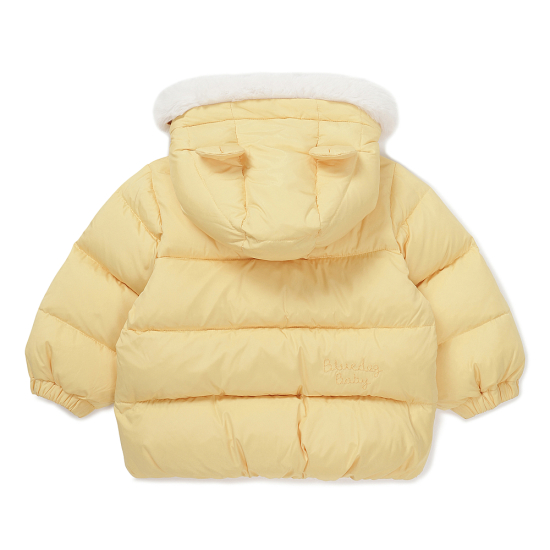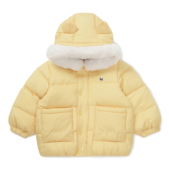 오리털 충전재이며 앞위 다른소재감과 세련된 컬러감으로 후드에 셔링장식과 둥근 핏감으로