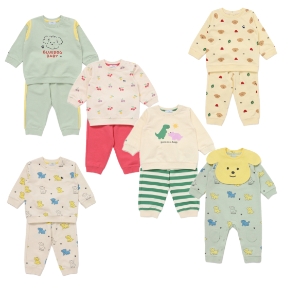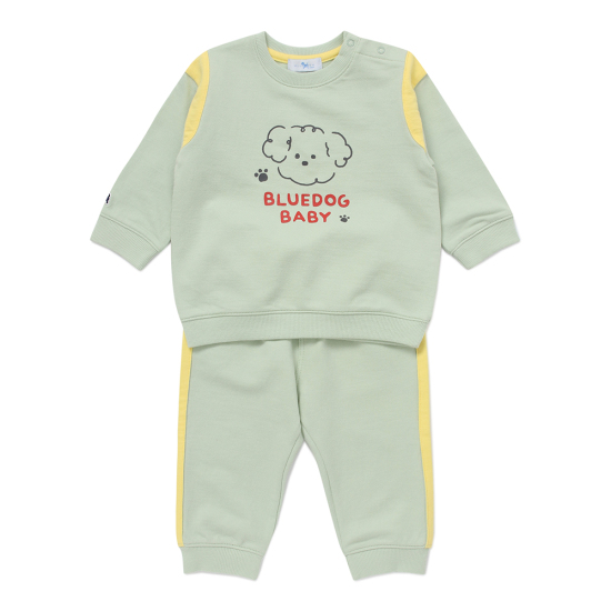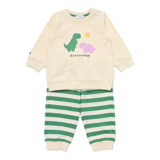 톡톡한 면소재를 사용하여 활동성이 편안한 상하세트로 공룡 포인트의 상의와 스트라이프