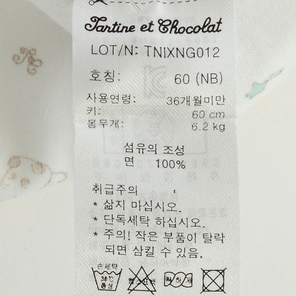 세탁방법 및 취급시 주의사항 : 삶지 마십시오, 단독세탁 하십시오, 주의! 작은 부품이 탈락되면 삼킬 수 있음.