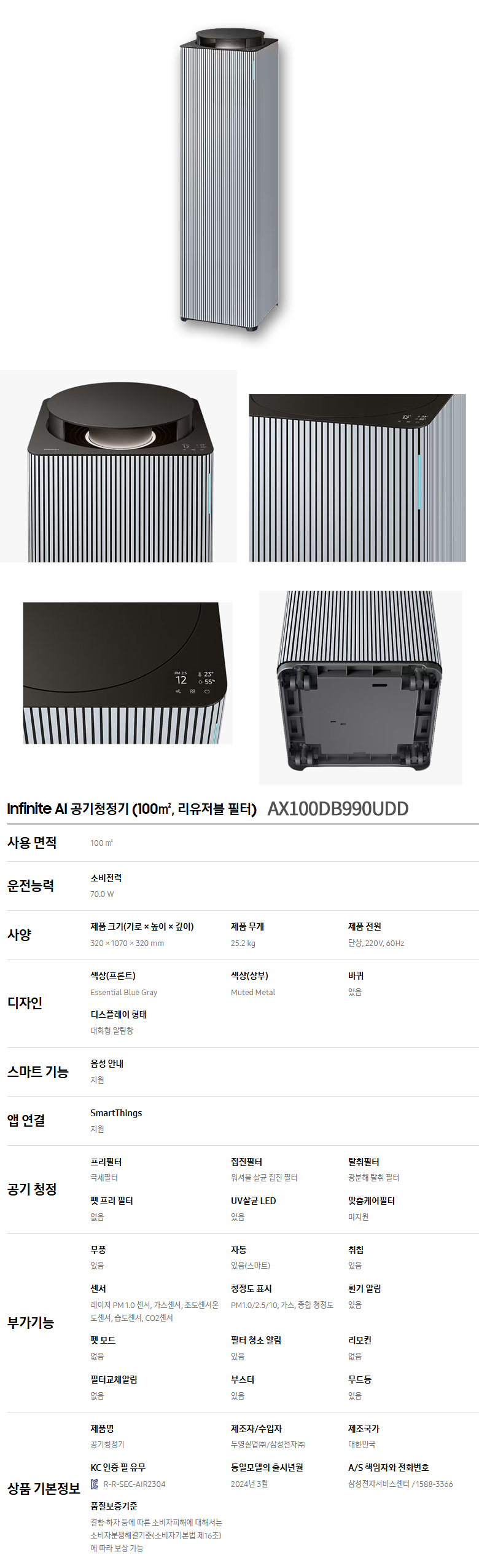 삼성 AX100DB990UDD 인피니트 리유저블 필터 공기청정기 에센셜 블루 그레이