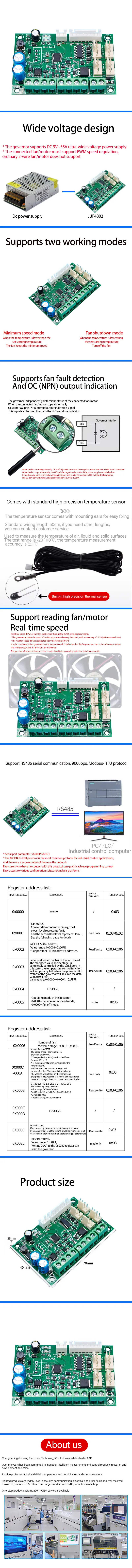 산업 기술 솔루션, 메인 제어 칩으로서의 ARM 코어 MCU는 직렬 포트 프로토콜 제어 PWM 출력 듀티 비율을 통해 RS485 직렬 통신을 지원하여 팬/모터 속도 제어를 달성하며, 직렬 포트 지침은 modbus-rtu 프로토콜, 전송 속도 9600bps, 팬 속도 0-100% 조절 가능합니다. 읽기 팬 속도, 팬 오류 감지 및 기타 기능 지원,