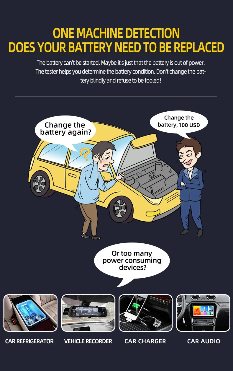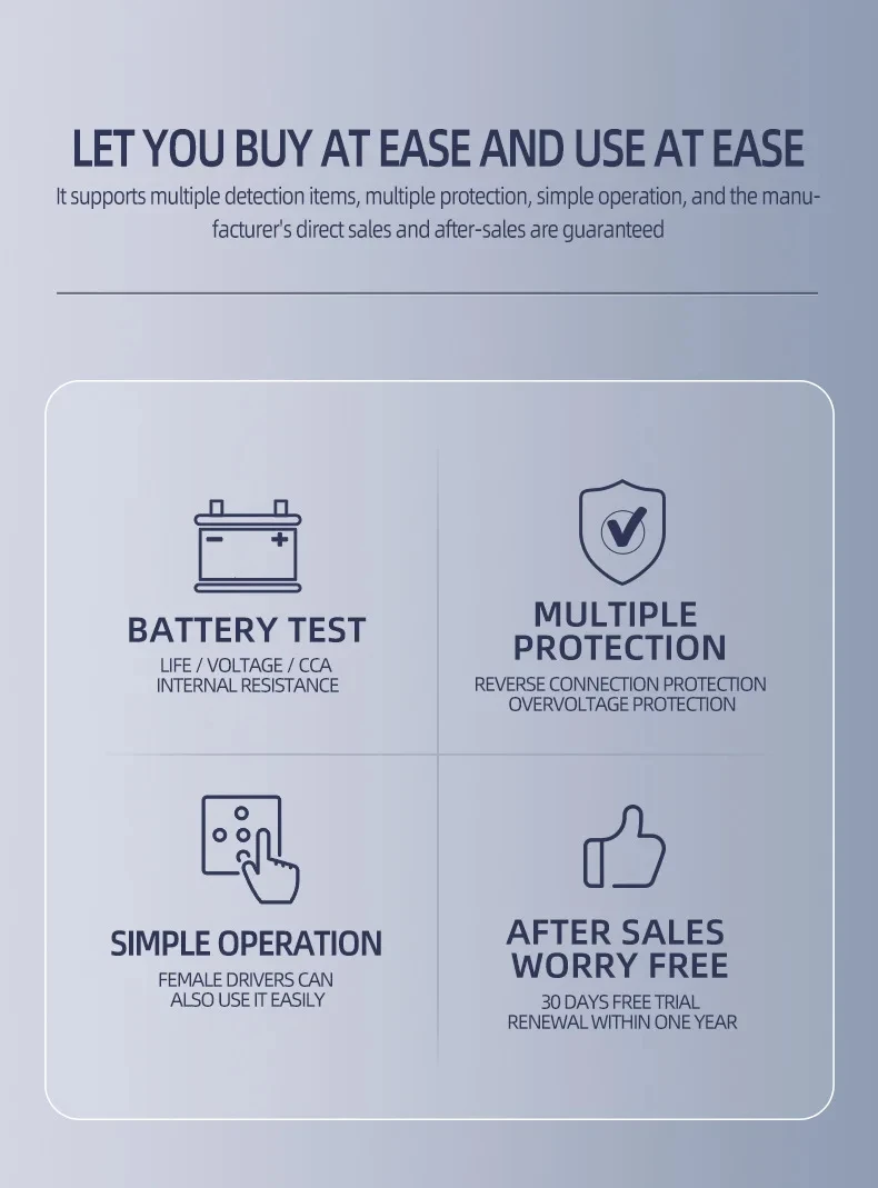 ? 12V 및 24V 배터리 시스템 테스트:이 제품은 12V 및 24V 배터리 시스템을 테스트 할 수있어 자동차 및 트럭 소유자에게 다양하고 편리합니다.