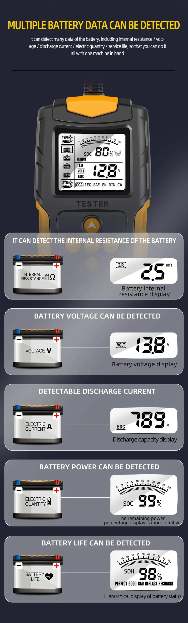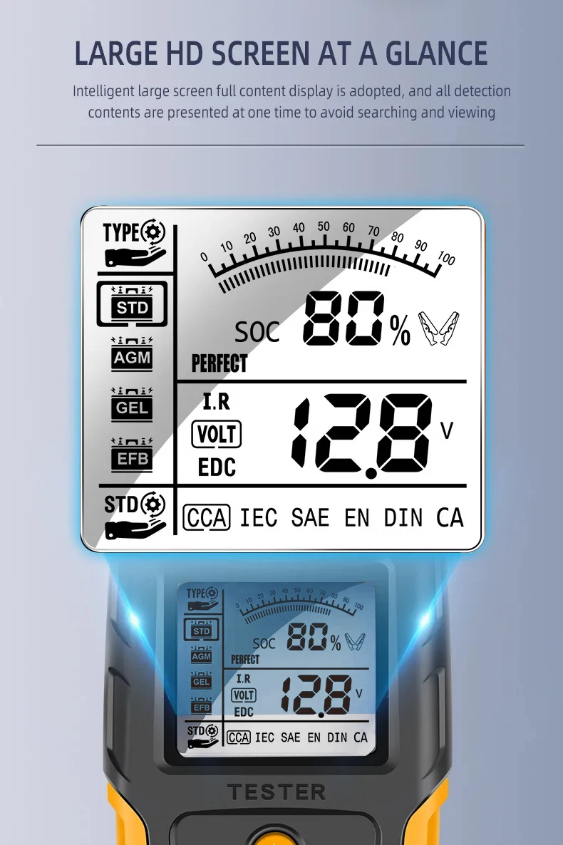 ? SOH, SOC 및 CCA 측정:SOH, SOC 및 CCA를 측정할 수 있는 이 제품은 배터리 상태 및 용량에 대한 포괄적인 정보를 제공합니다.