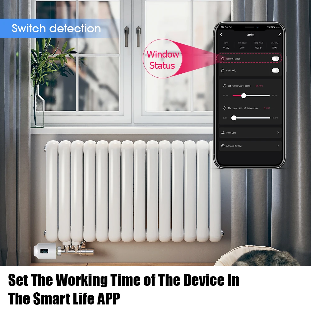 4. 열린 창 감지: 실내 온도가 갑자기 온도로 떨어지면. 임계 값, 밸브는 15 분 동안 닫힙니다. 그 후, 실내 온도. 여전히 온도보다 낮습니다. 임계 값은이 모드를 유지합니다. 게다가 섭씨 온도의 디지털 디스플레이를 쉽게 읽을 수 있습니다.