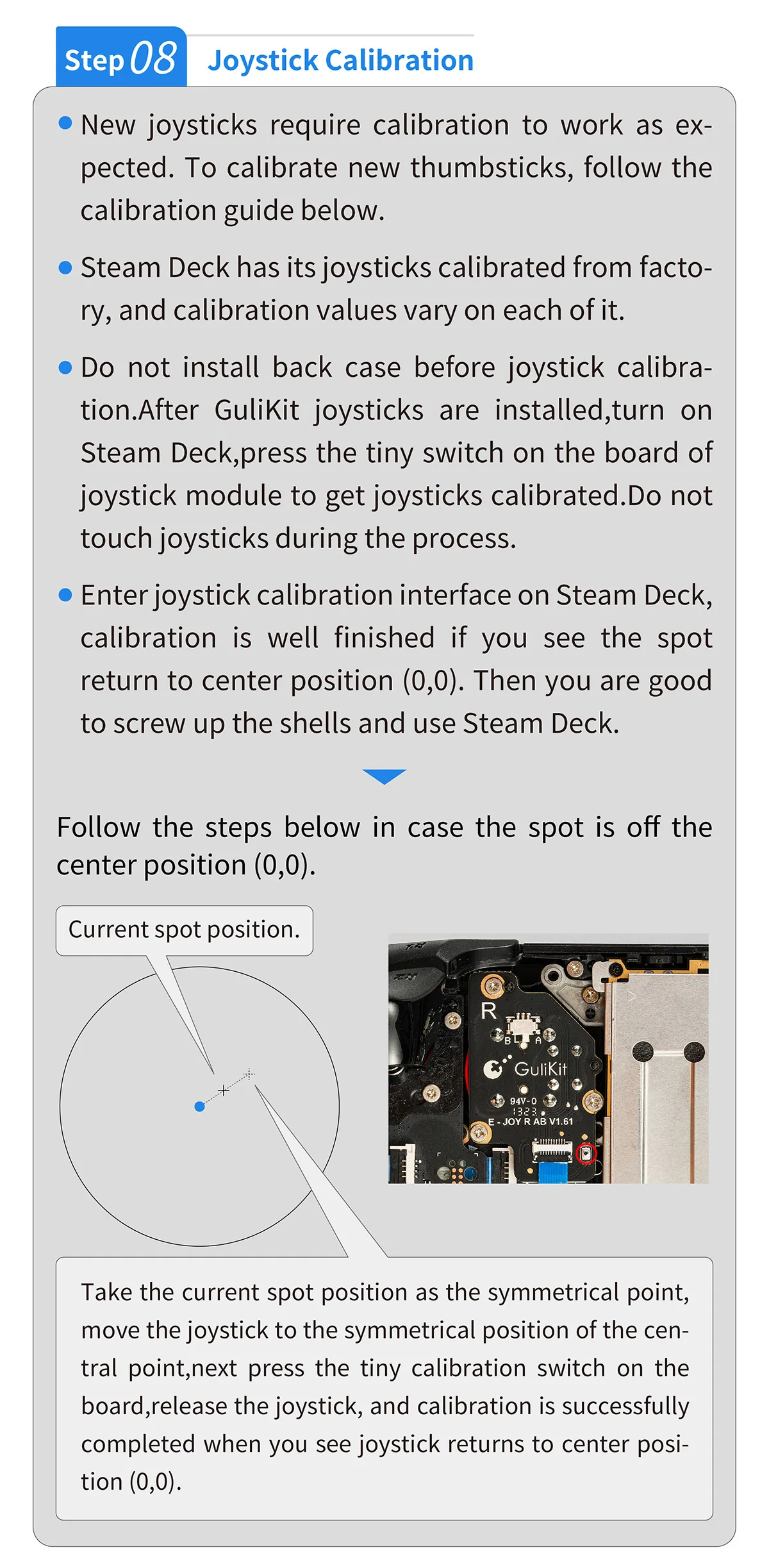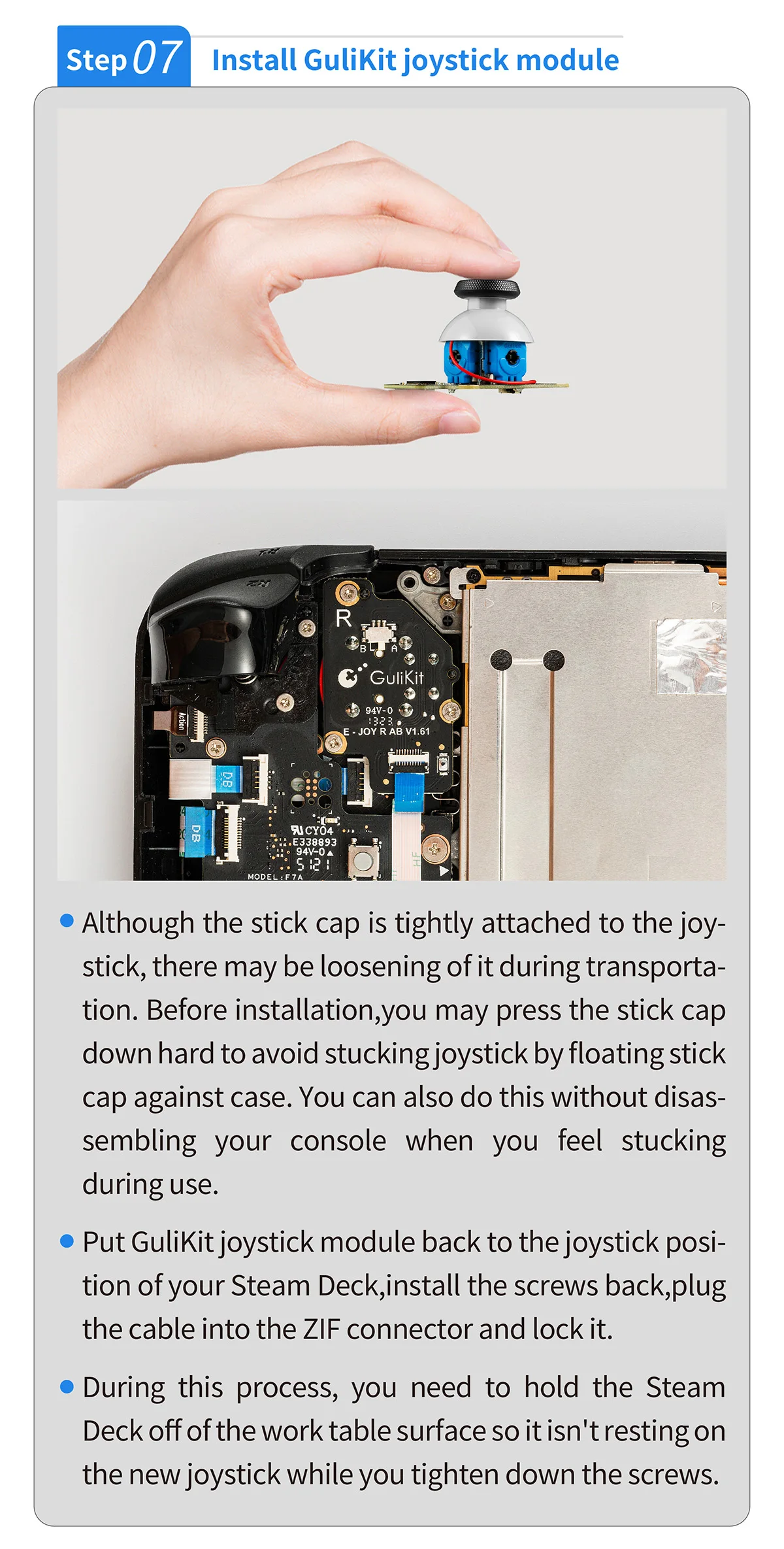 5. 스틱 터치 감지 기능은 Steam Deck의 스틱 캡의 와이어를 Gulikit 조이스틱 모듈에 수동으로 용접 할 때 작동합니다.