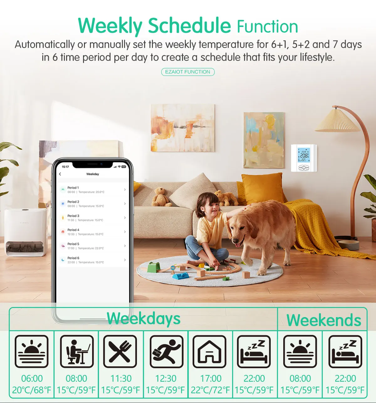 주간 프로그래밍 가능5 + 2/6 + 일주일에 1/7 일, 평일에는 6 기간, 휴일에는 2 기간으로 일상 생활과 생활 습관에 따라 개인 난방 일정을 설정할 수 있습니다.