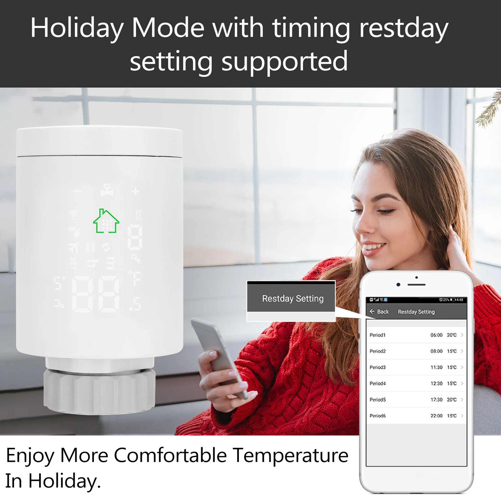 열린 창 감지: 실내 온도가 갑자기 온도로 떨어질 때. 임계 값, 밸브가 15 분 동안 닫힙니다. 그 후, 방 온도라면. 여전히 온도보다 낮습니다. 임계 값은이 모드를 유지합니다. 게다가 섭씨 온도의 디지털 디스플레이를 읽기 쉽습니다.