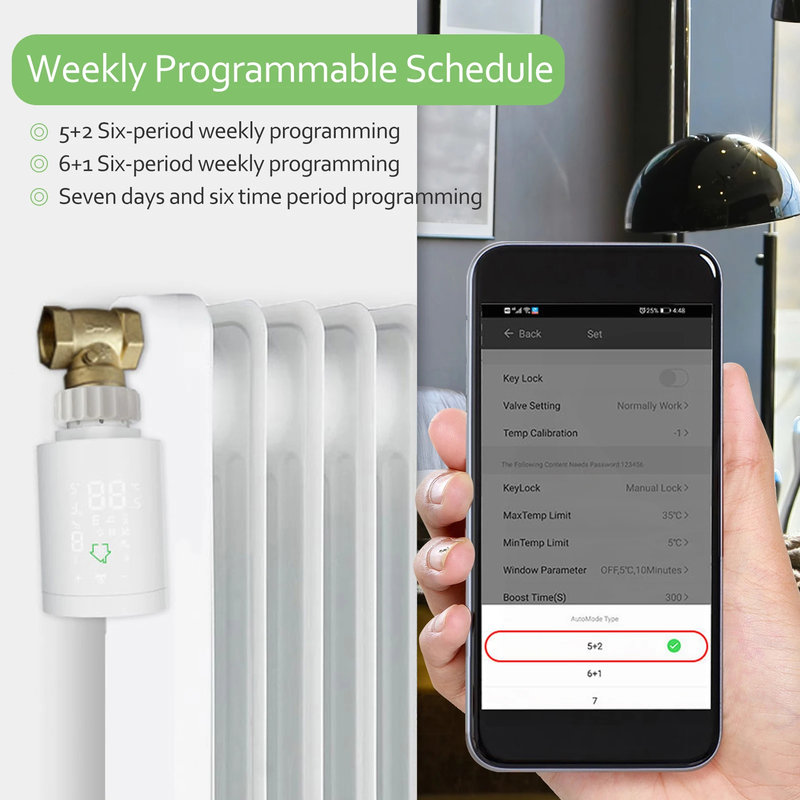 주간 프로그래밍 선택으로 프로그래밍 가능한 일정: 옵션 6 기간이있는 5 + 2, 6 + 1 및 7 일 주간 일정 수동 설정을 지원합니다. 다른 상황에 대한 최대한의 편의성을 제공하고 집 온도에 대한 맞춤형 일정을 설정합니다. 휴일 모드, 자동 모드, 부스트 모드 사용 가능. 자신의 마음을 충족시키기 위해 근무일과 휴식 모드를 선택하십시오.