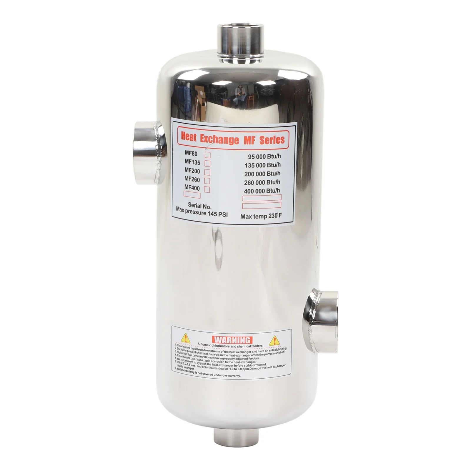 최대화 된 열 전달:특수 설계된 유량 제한기를 통해이 열교환 기는 압력 손실을 최소화하고 최대 열 교환을 보장하여 최적의 성능을 제공합니다. 수영장, 온수 욕조또는 스파.