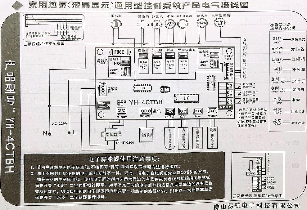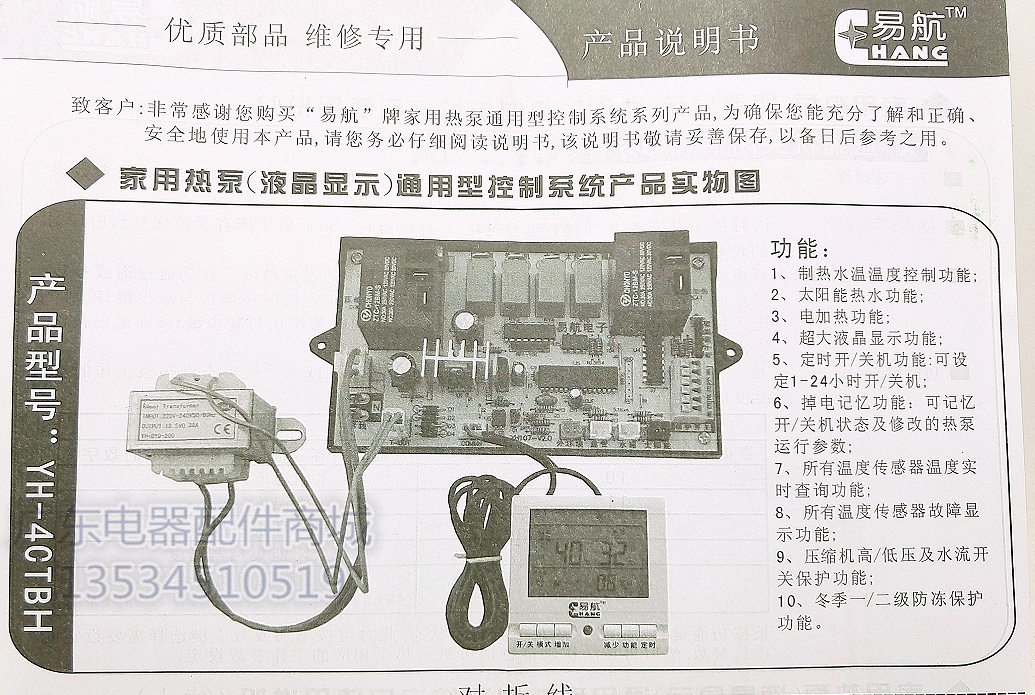 The controller is a special controller for heat pump water heater, with three temperature sensors (water temperature, external temperature, coil temperature), three-way control output (compressor, defrosting, fan), one alarm signal input (for high and low pressure protection) Wait). The main functions are as follows: