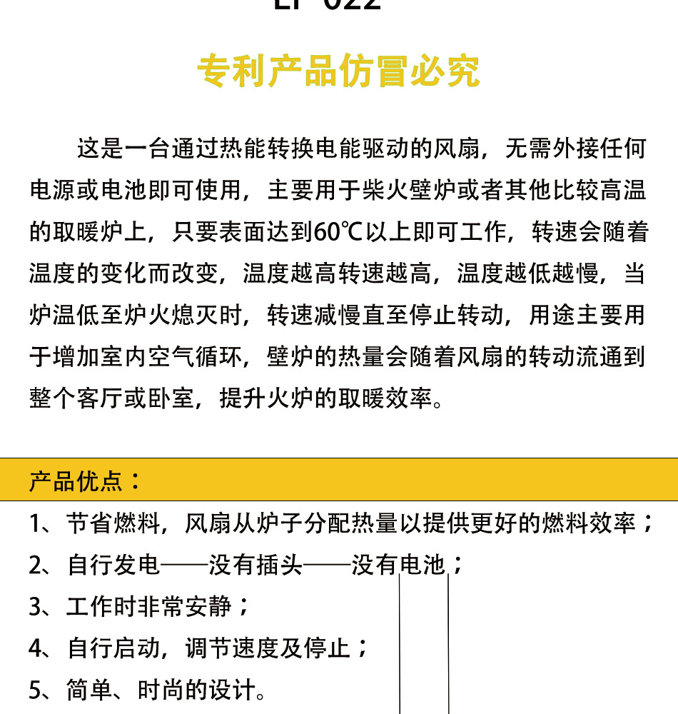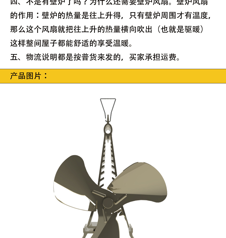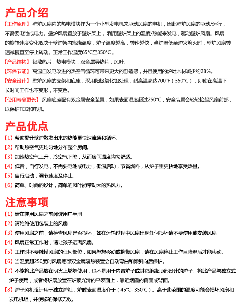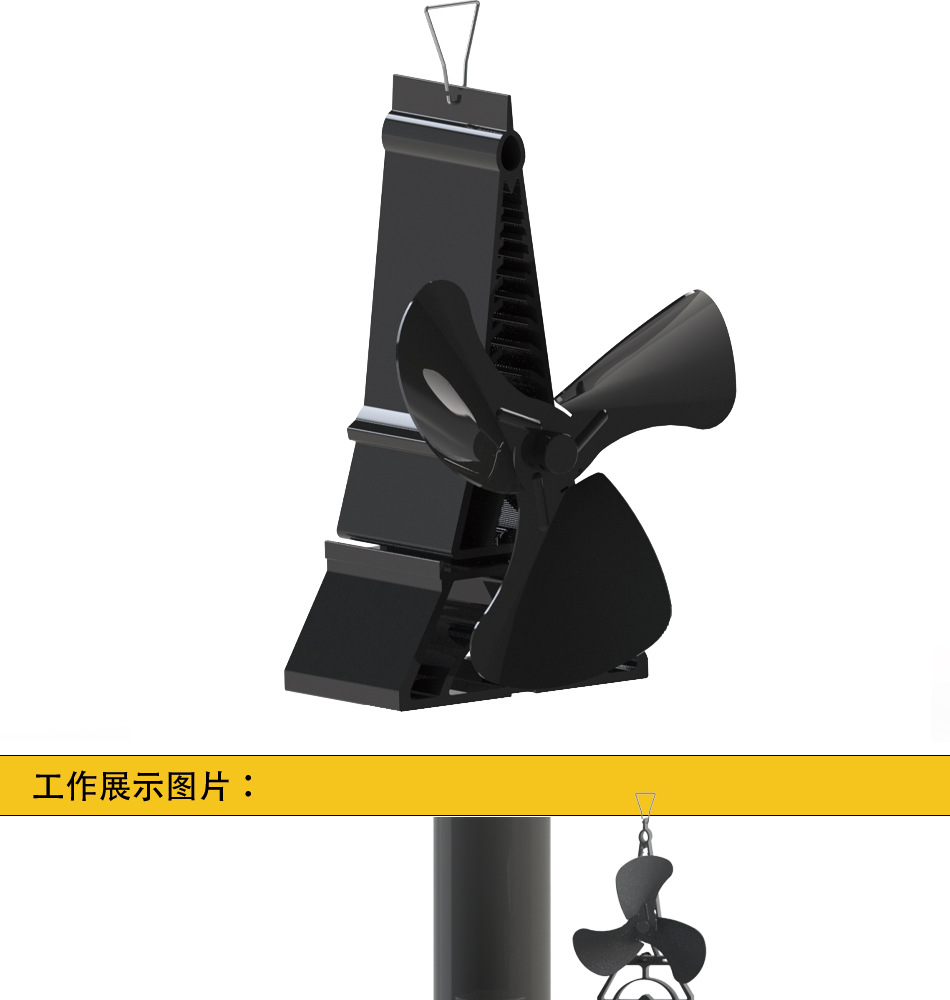 也就是?,只要把?放在燃?的?子上?,?就?吸收?能???扇??,?而?燃木壁?上方的?空?直接吹向生活?,增加房?中的空?流通,提升火?的加?效率