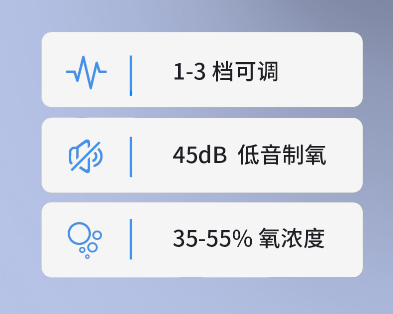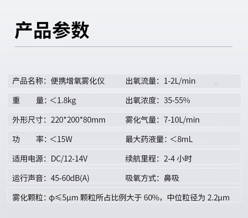 | 색상 분류 | 가정용 무배터리 버전 ZY-801A, 2시간 배터리 항속 버전 ZY-801B, 4시간 배터리 항속 버전 ZY-801C, 벤이캉 1리터 산소 발생기 |