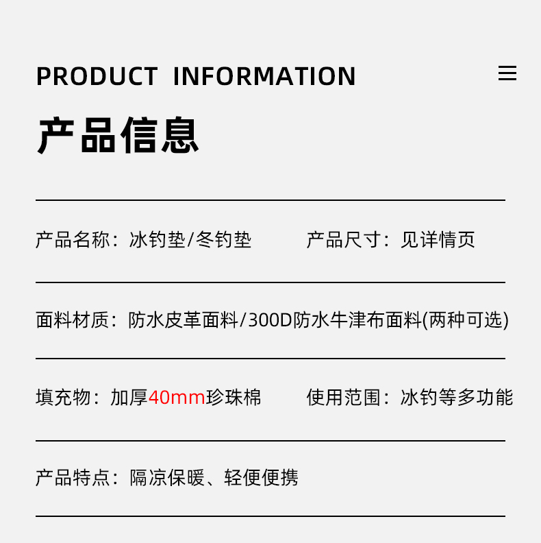 색상 분류 : 4 패브릭 스몰 육각 얼음낚시 매트 대각 사이즈 2 6m 두께 40MM ![]() | 색상 분류 : 5 패브릭 빅육각 얼음낚시패드 대각사이즈 3 두께 40MM ![]() | 색상 분류 : 6 가죽 타입 가로 1 6X세로 1 6m 두께 40MM ![]() |