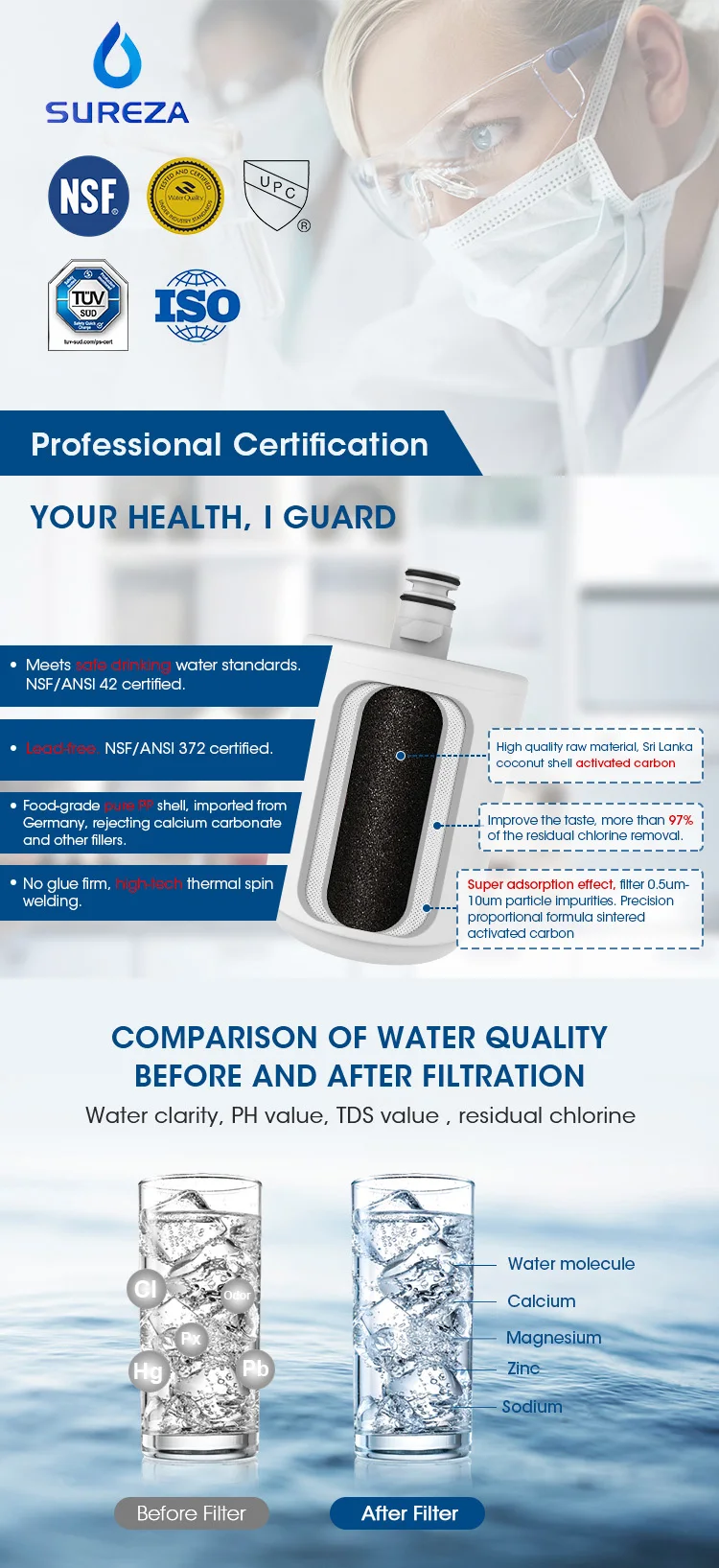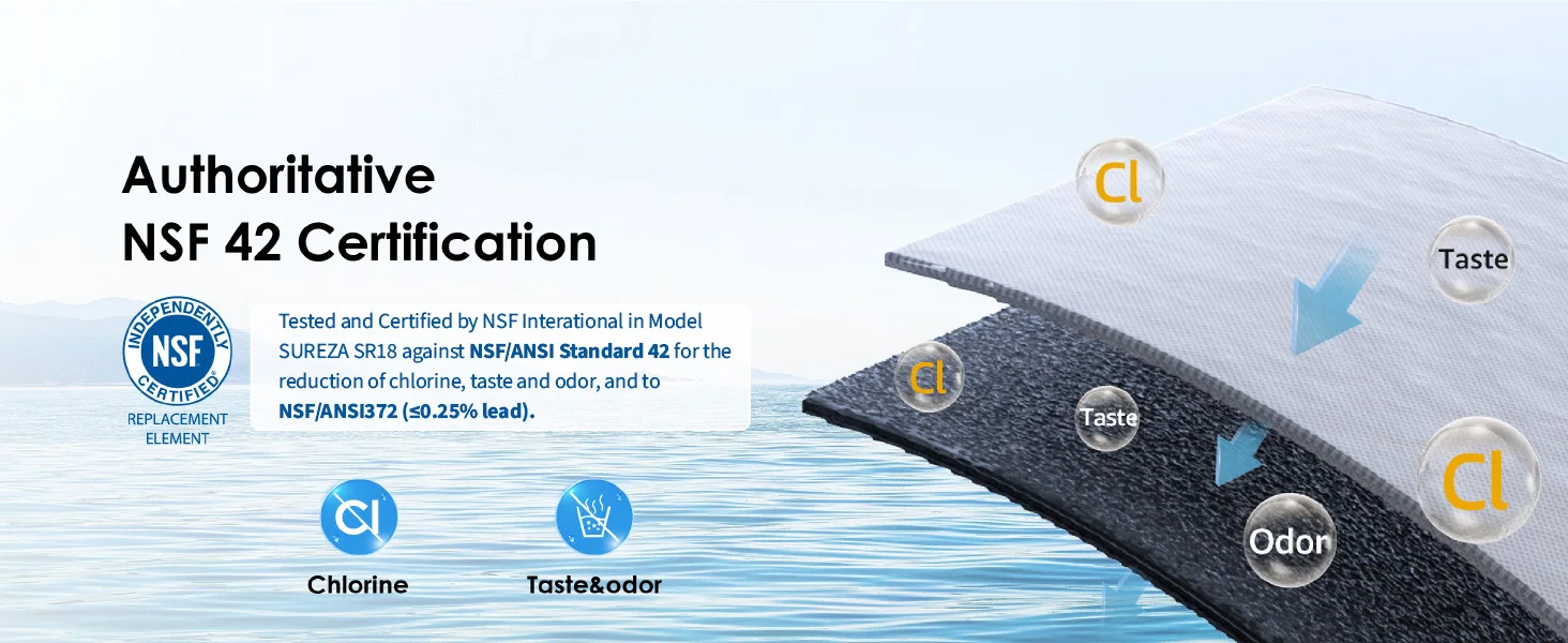 【인증 및 테스트】: NSF International이 염소 맛과 냄새의 흡수에 대해 NSF 표준 42 에 대해 테스트 및 인증했습니다.