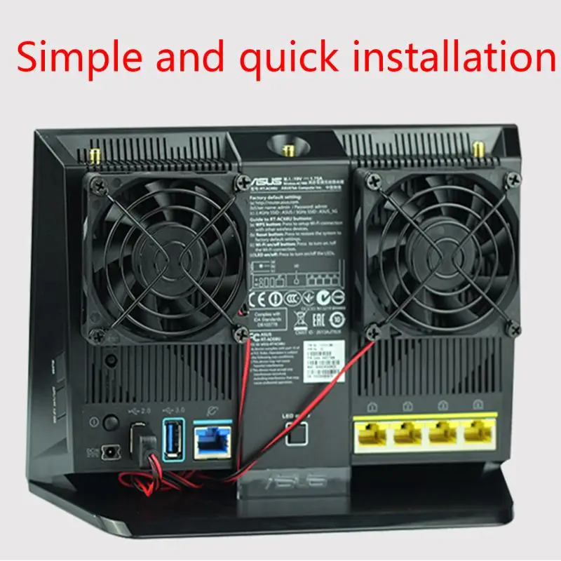 설치: 팬을 라우터 뒷면의 통풍구에 직접 연결하십시오. 접착제는 팬 프레임에 부착해야하며 회전 팬 블레이드에는 부착하지 않아야합니다.
