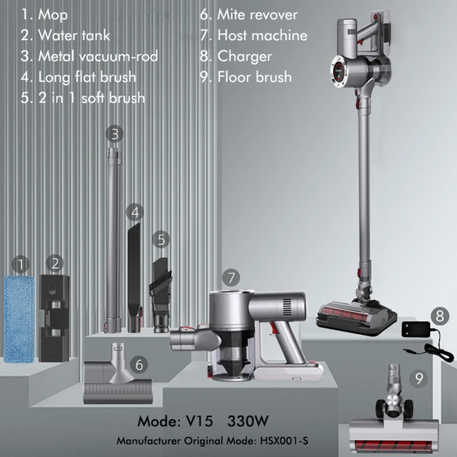 V15 무선 휴대용 진공 청소기 28kPa 330W 전원 5-in-1 수직 청소기 LED 화면 전기 진공 청소기 물 탱크 스위퍼 걸레질 기계 조정 가능한 진공 막대 이동식 배터리