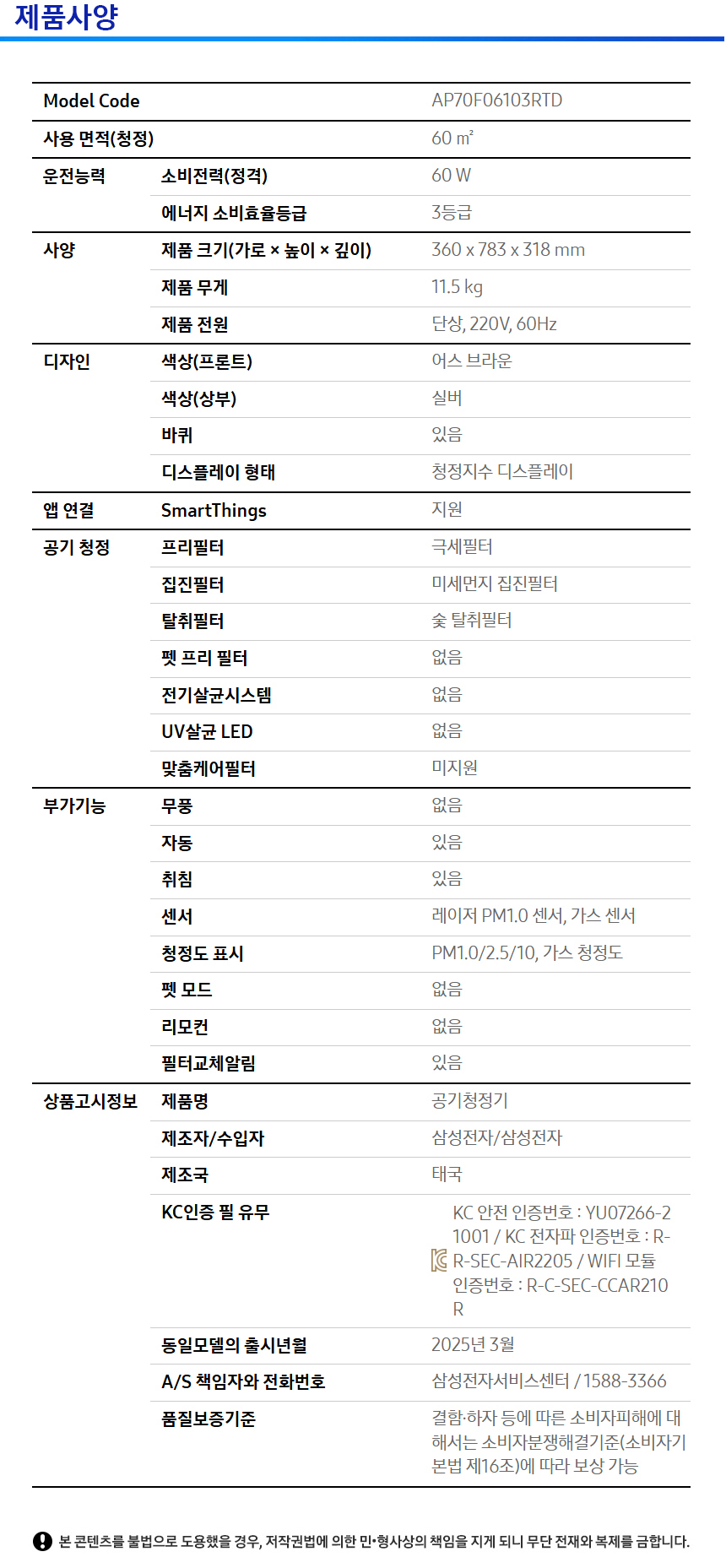 (18형)삼성 블루스카이 공기청정기 5500(60㎡) AP70F06103RTD