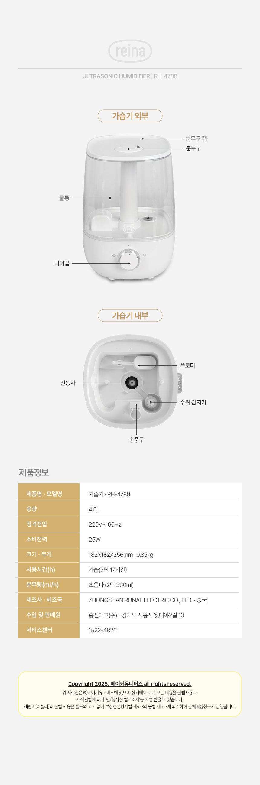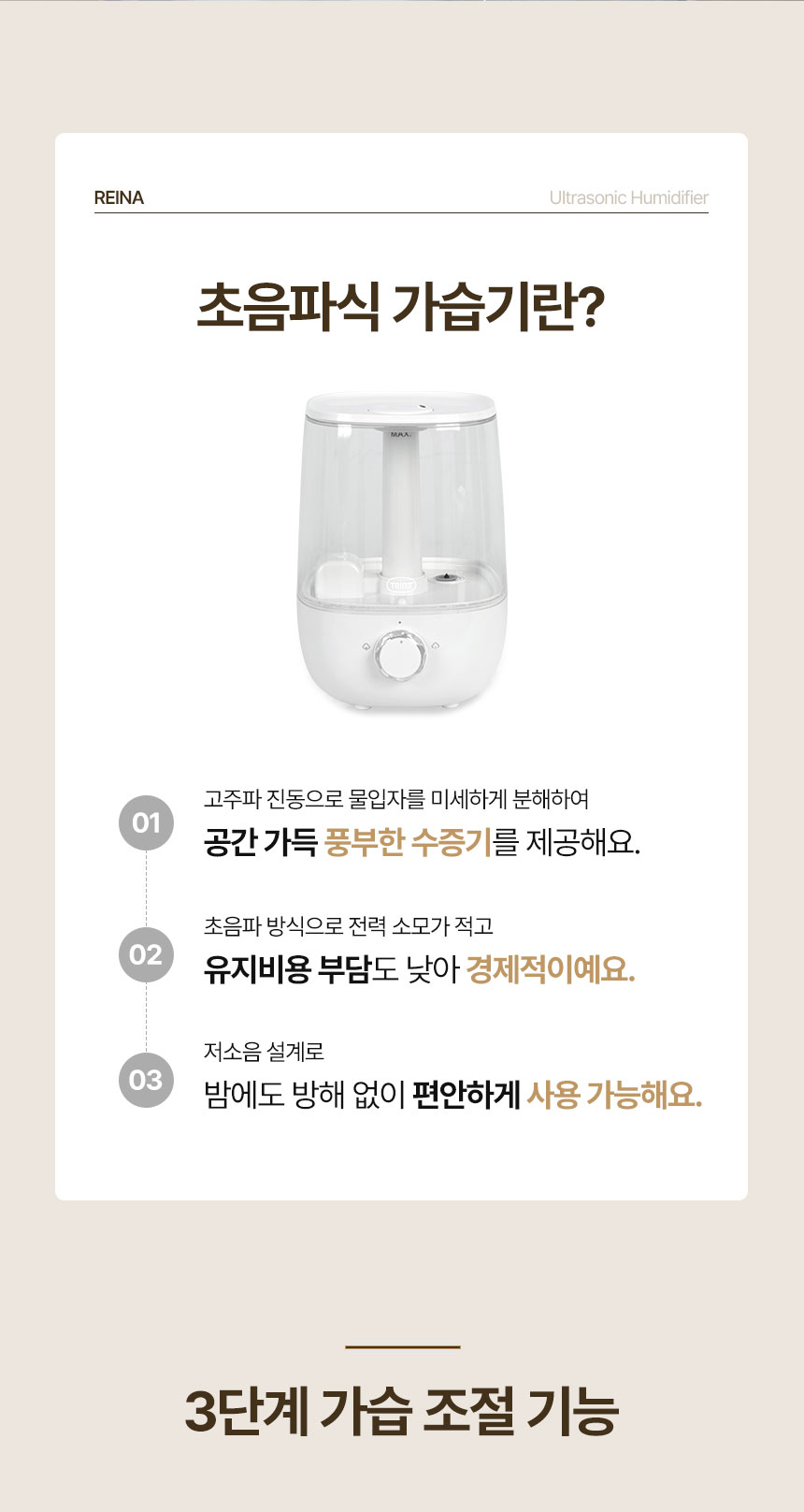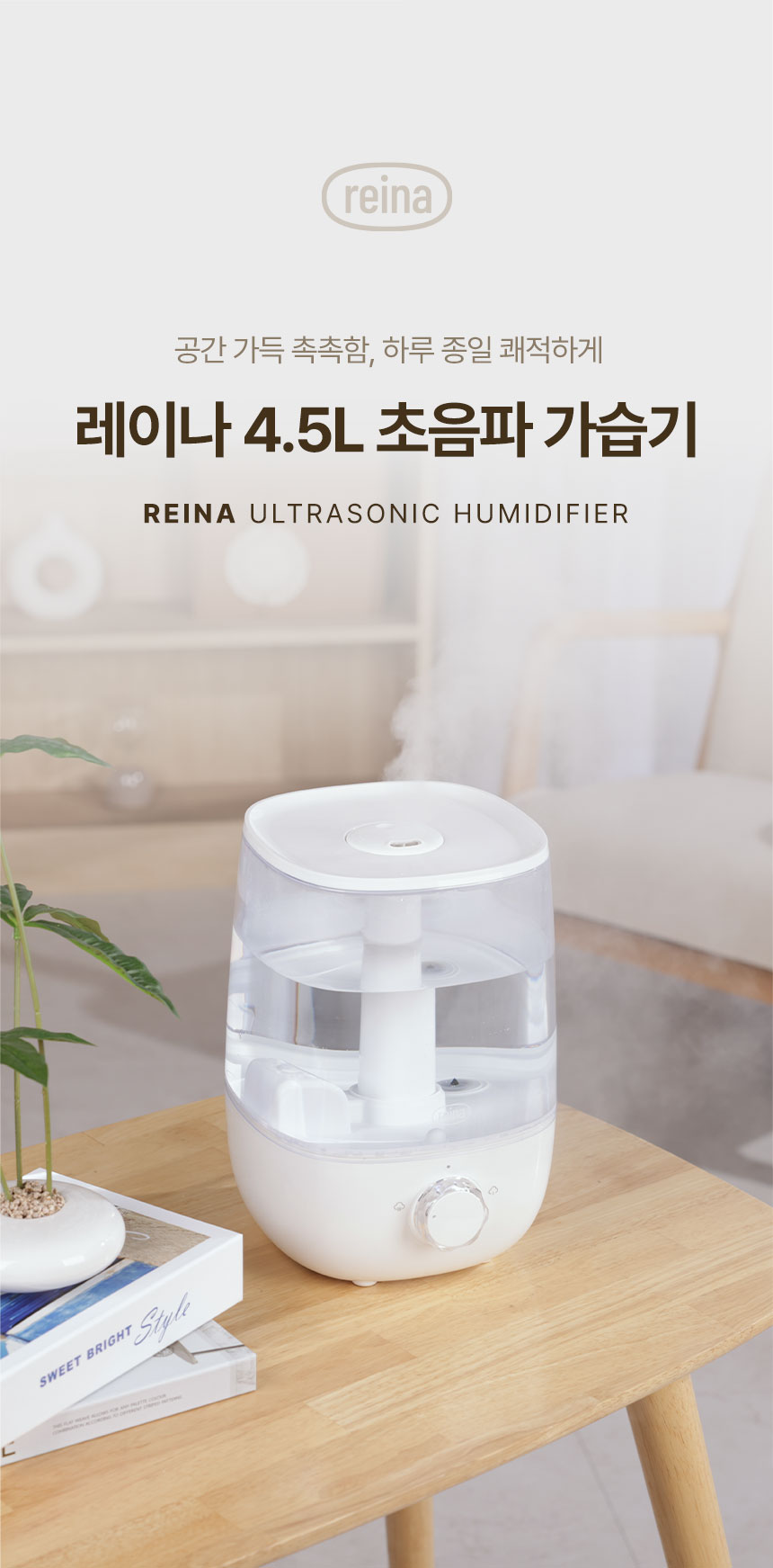 내일도착 REINA 초음파식 가습기 RH-4788 대용량 4.5L 저소음 통세척 상부급수