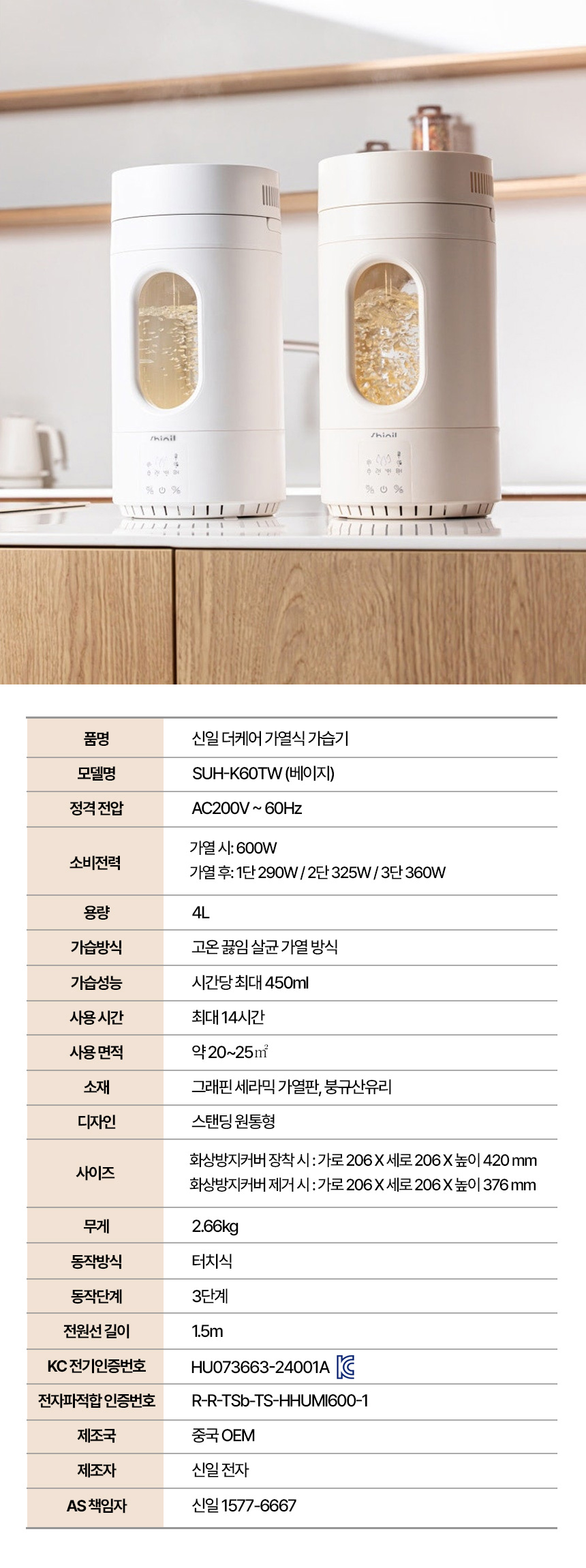 | 품명 및 모델명 | 신일 더케어 대용량가습기 가열식 아기 가습기 가정용 사무실용 SUH-K60TW |
