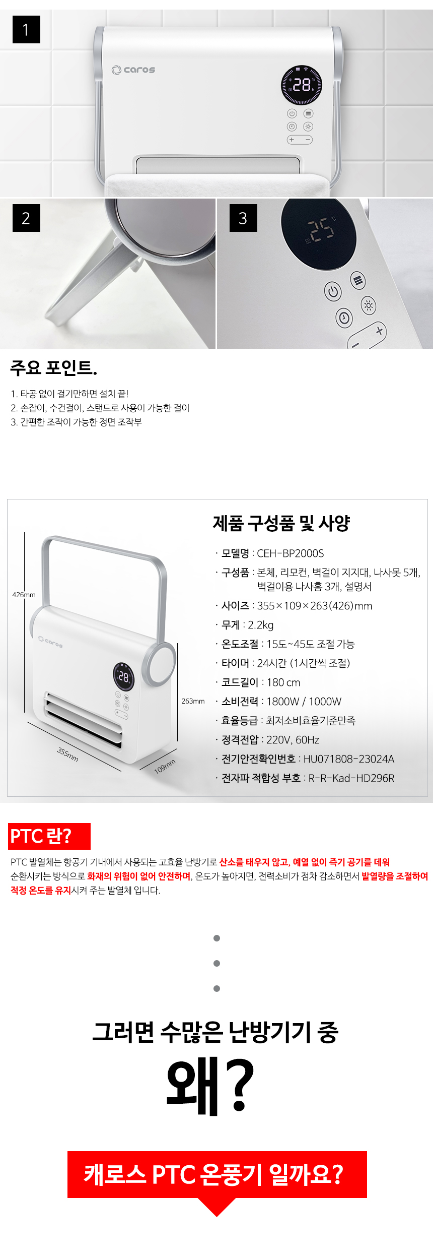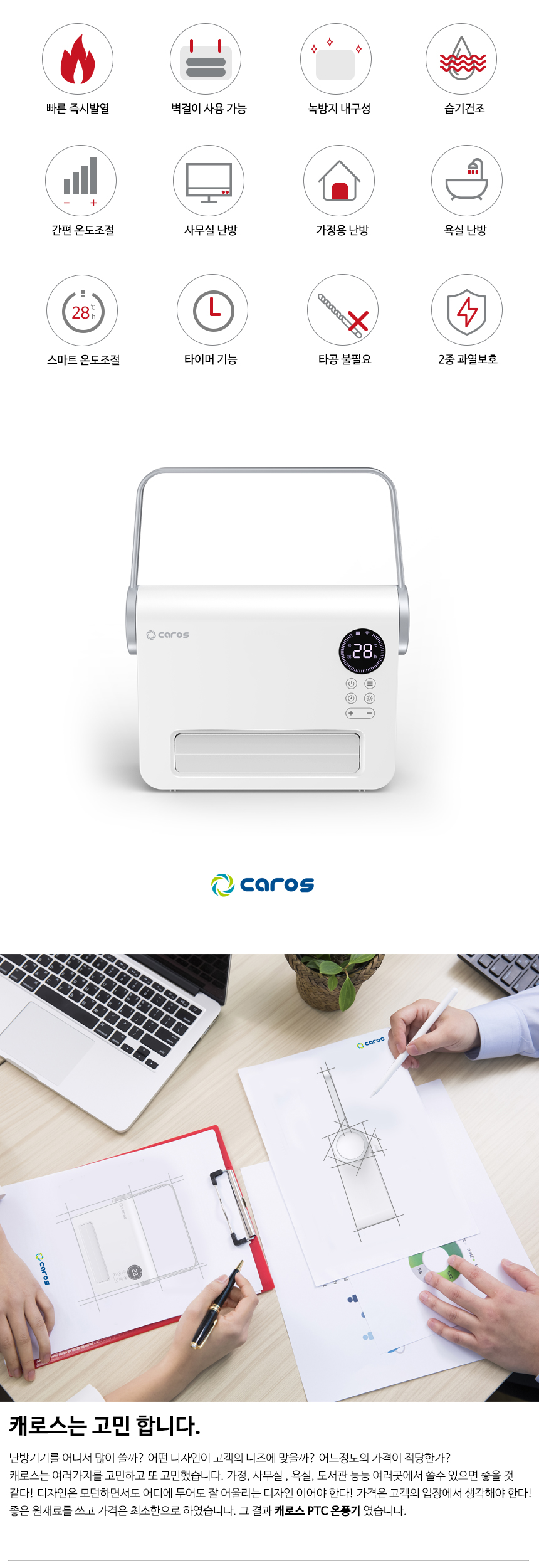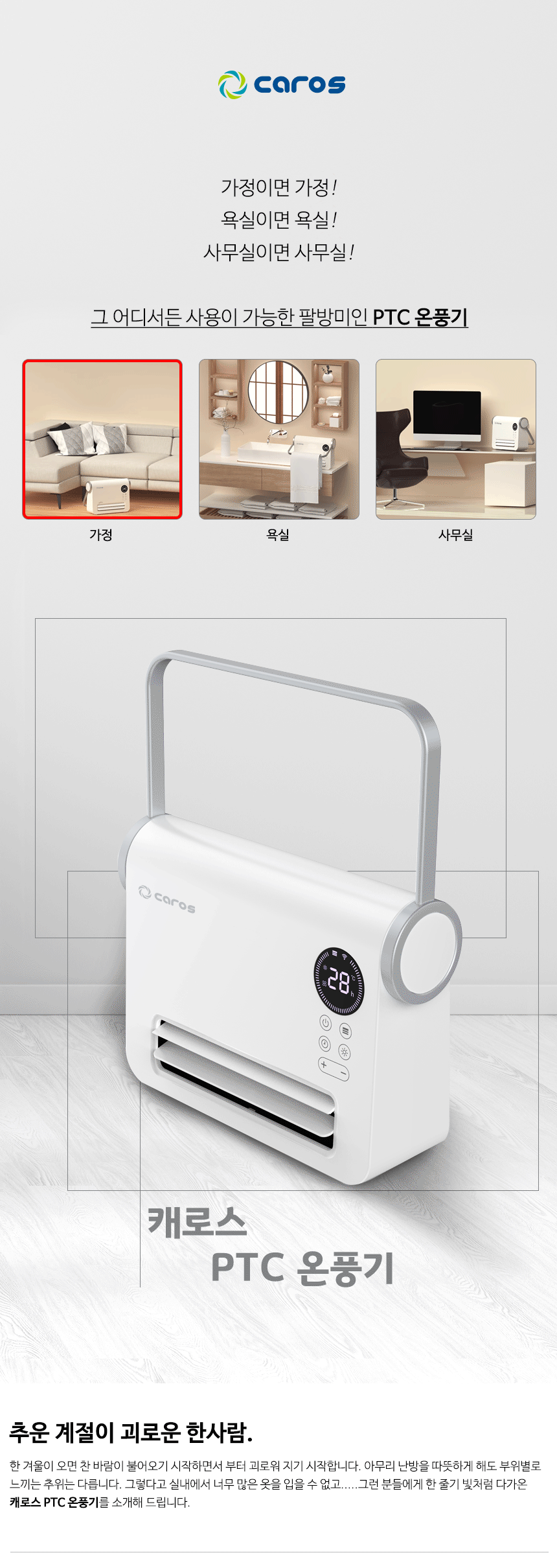 캐로스 욕실 온풍기 CEH-BP2000S PTC 화장실 난방기 캠핑 미니 전기난로 히터 간편설치 어디서든 사용가능
