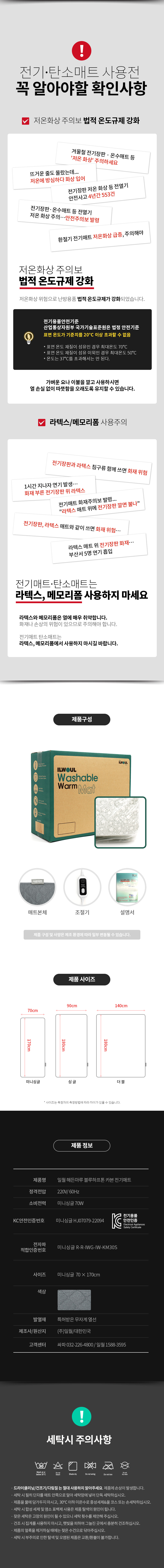 일월 전기매트 워셔블 초절전 70W 싱글 온열매트 1인용 장판 일월전기매트