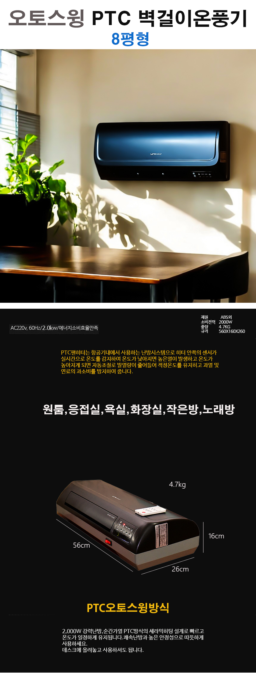 ptc오토스윙/대용량10평/가정용벽걸이온풍기히터 2kw