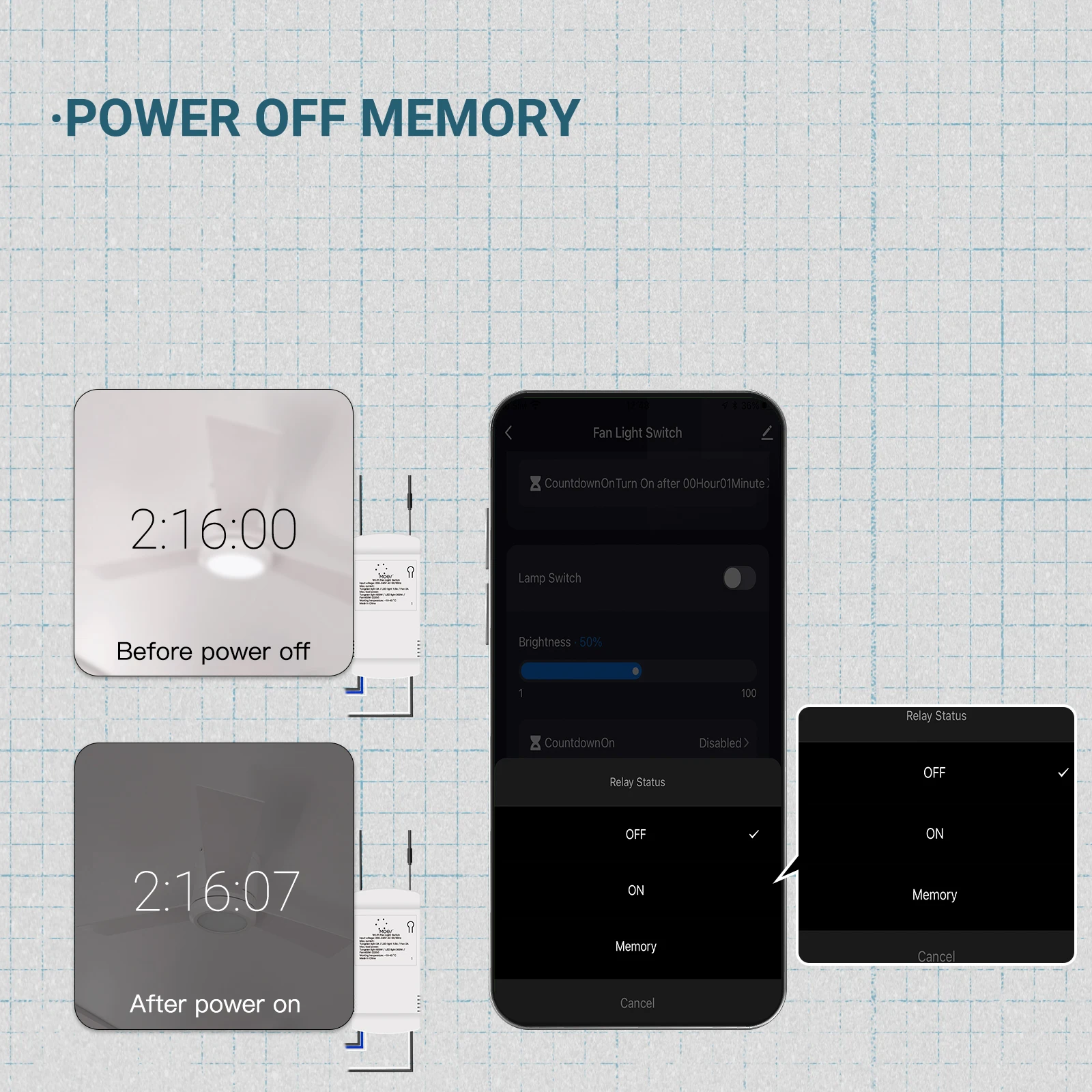 전원 끄기 메모리 기능을 선택하면 전원 공급 후 팬 표시등이 릴레이 상태로 돌아가고 나머지는 영향을 미치지 않습니다.