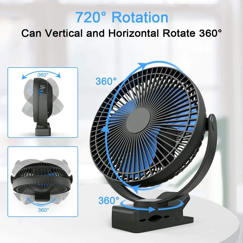 [2 in 1 팬] 휴대 팬은 클립 팬과 탁상용 팬을 겸용합니다. 책상 가장자리, 러닝 머신 프레임 또는 과열 경향이있는 사람들을위한 나이트 스탠드와 같은 특이한 장소에 부착 할 수있는 강력한 3 인치 클램프를 사용합니다.