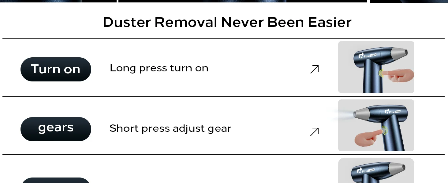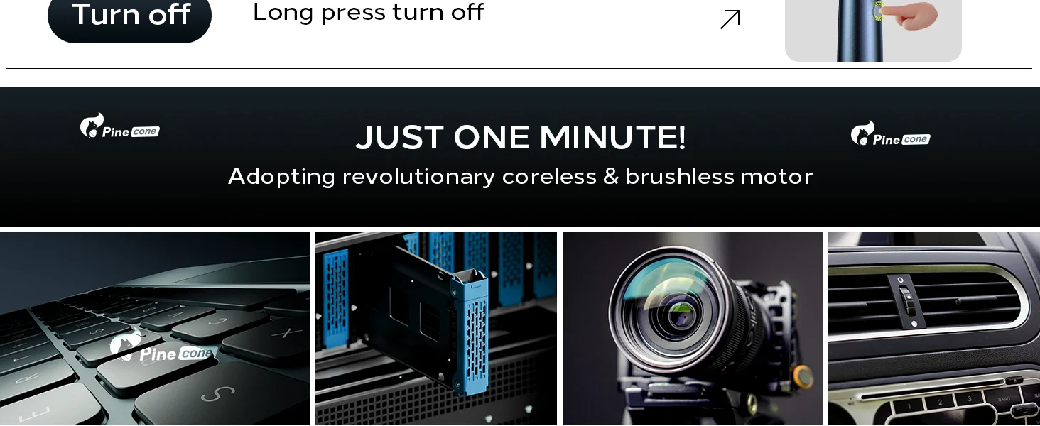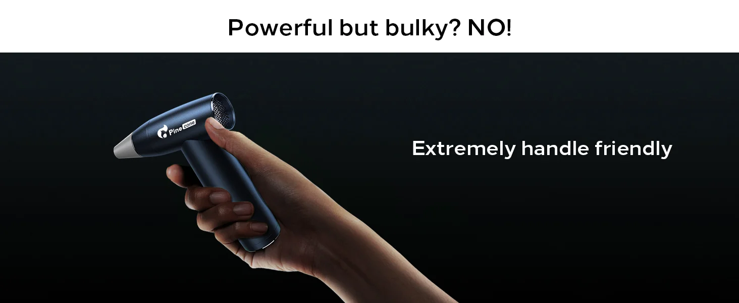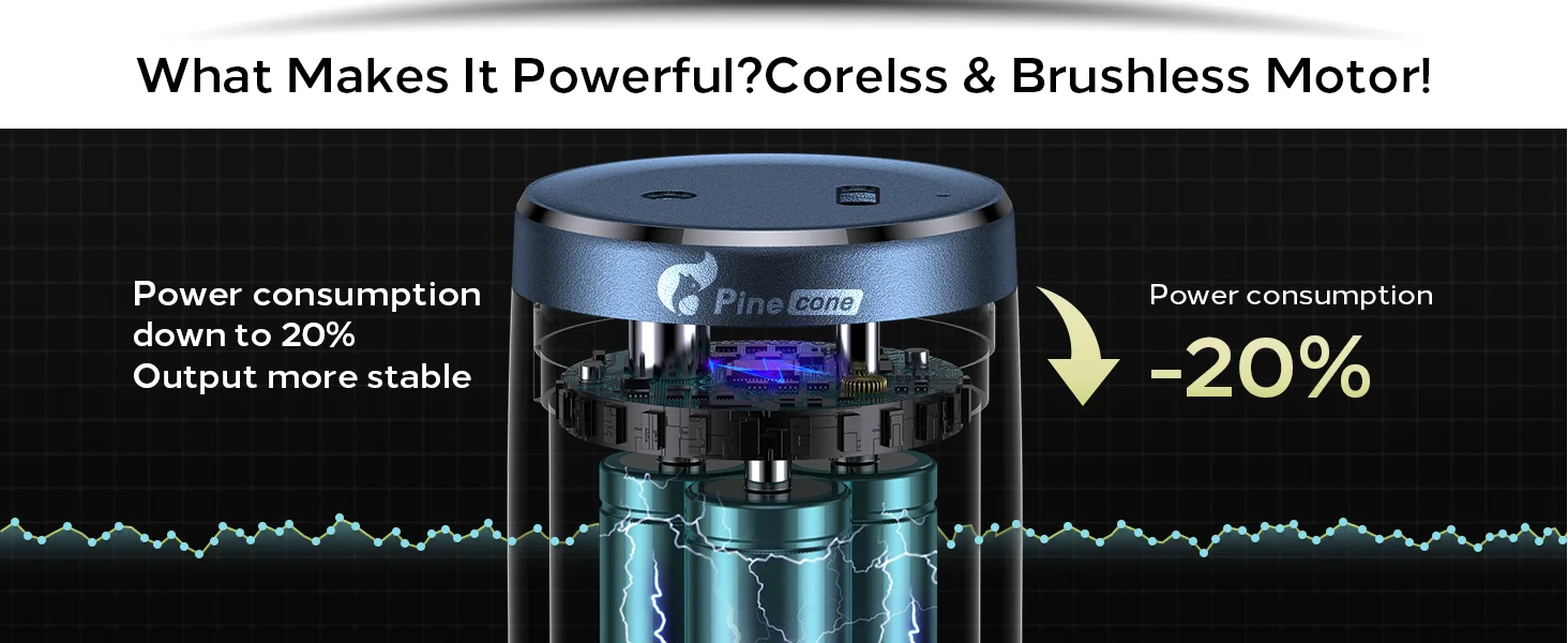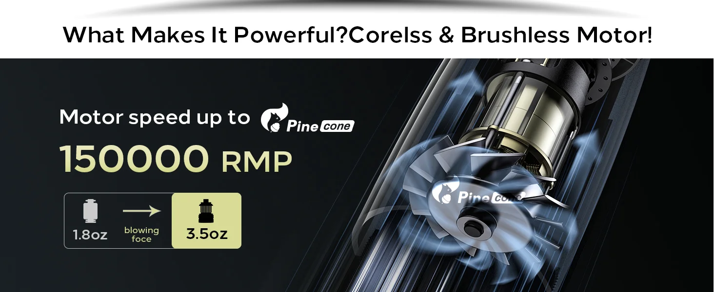 PINECONE 공기 살포기 압축 공기는 완벽한 솔루션을 제공합니다. 혁신적인 코어리스 및 브러시리스 모터를 채택하여 일반보다 90% 강한 송풍 력을 제공하며 모터 속도는 최대 150000 RMP이며 20% 까지 전력 소비를 줄입니다! 복잡한 먼지 제거 작업을 1 분 안에 쉽게 완료하십시오!