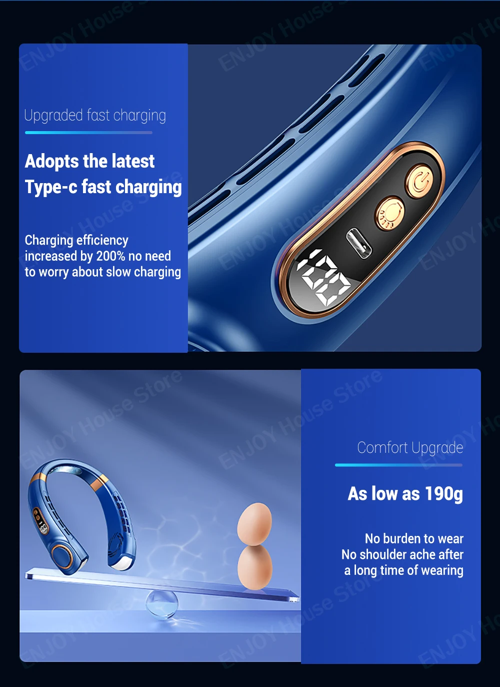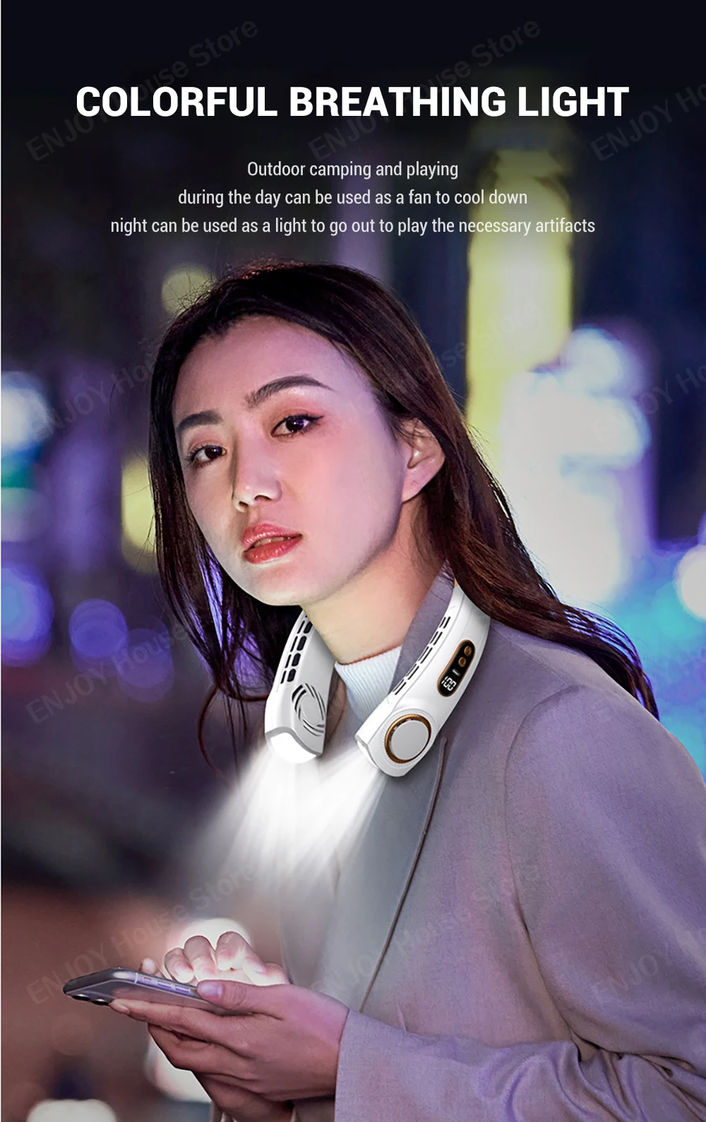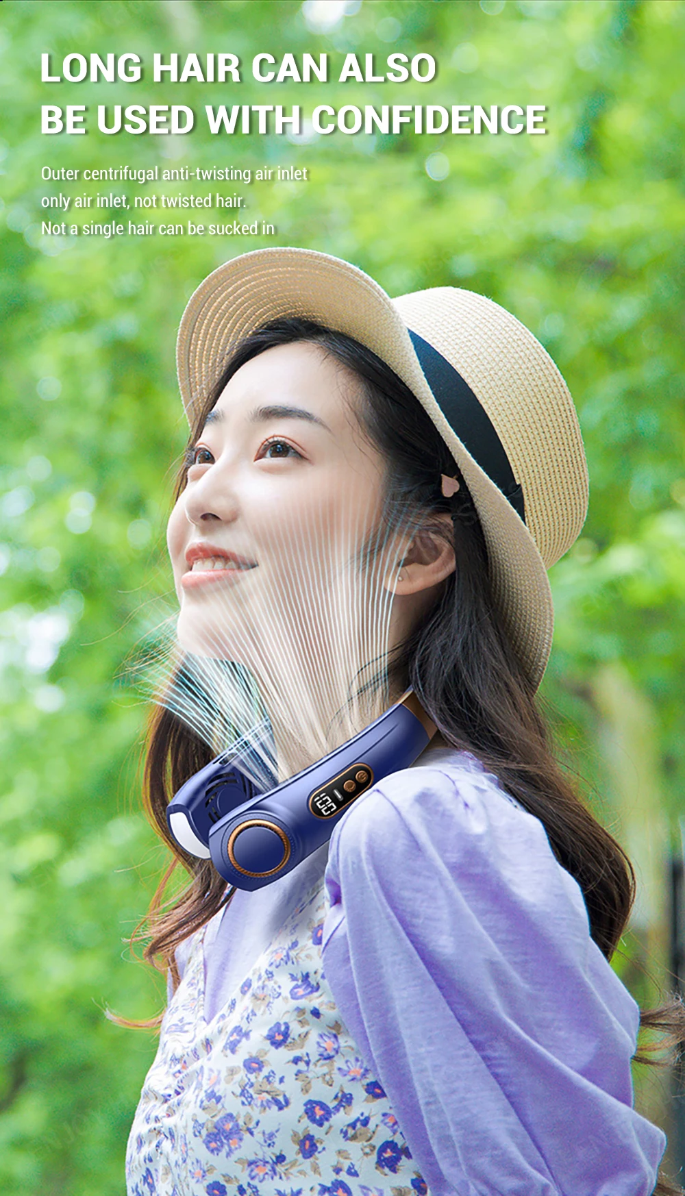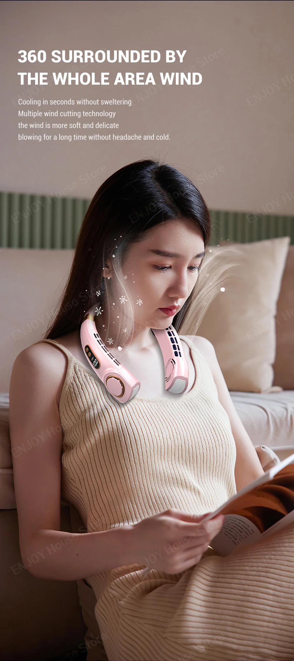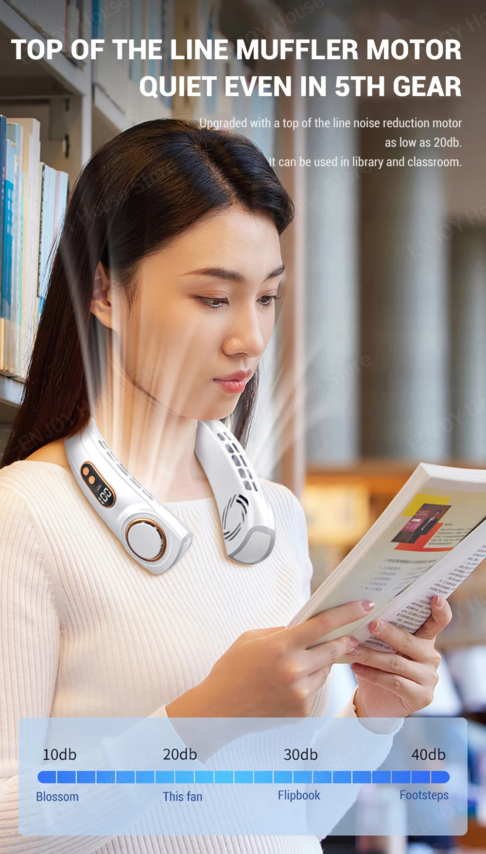 4. 편안하고 저소음: 교수형 목 팬은 편안하고 피부 친화적으로 사용하도록 설계되었습니다. 저소음 수준에서 작동하므로 사무실이나 독서와 같은 조용한 환경에 적합합니다. TV를 보거나 전화를 쉽게 걸 수도 있습니다.
