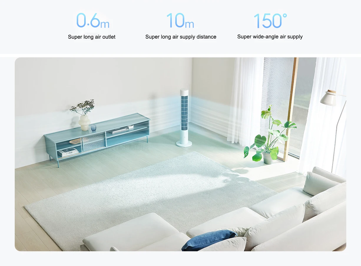날씬한 타워 디자인, 0.6m 슈퍼 롱 에어 콘센트 장착. 소파에서 낮잠을 자든 바닥에 앉든 머리부터 발끝까지 편안하고 자연스러운 바람을 즐길 수 있습니다. 150 ° 초 광각 공기 공급, 실내 공기 흐름을 가속, 그리고 더 빨리 냉각; 다른 청소 각도는 APP에서 조정할 수 있습니다, 온 가족이 모임에서 시원함을 즐길 수 있도록
