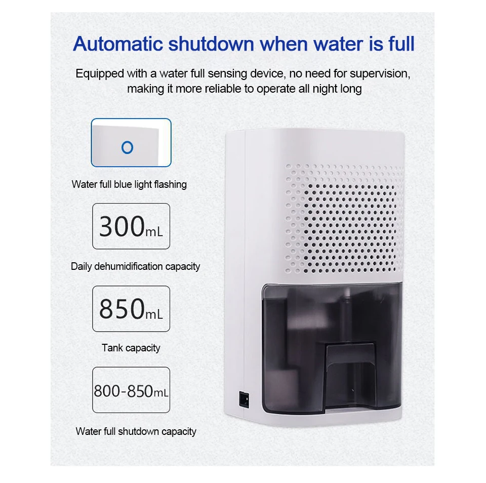 【자동으로 차단】 제습기의 위험을 피하기 위해 수조의 수량이 27-29 oz (800-850 ml) 에 도달하면. 제습기가 자동으로 꺼지고 파란색 표시등이 깜박여 알려줍니다. 참고: 모든 마이크로 제습기와 마찬가지로 최상의 작동 온도는 59-86 ° F입니다. 제습 효과는 41 ° F 이하에서는 분명하지 않습니다.