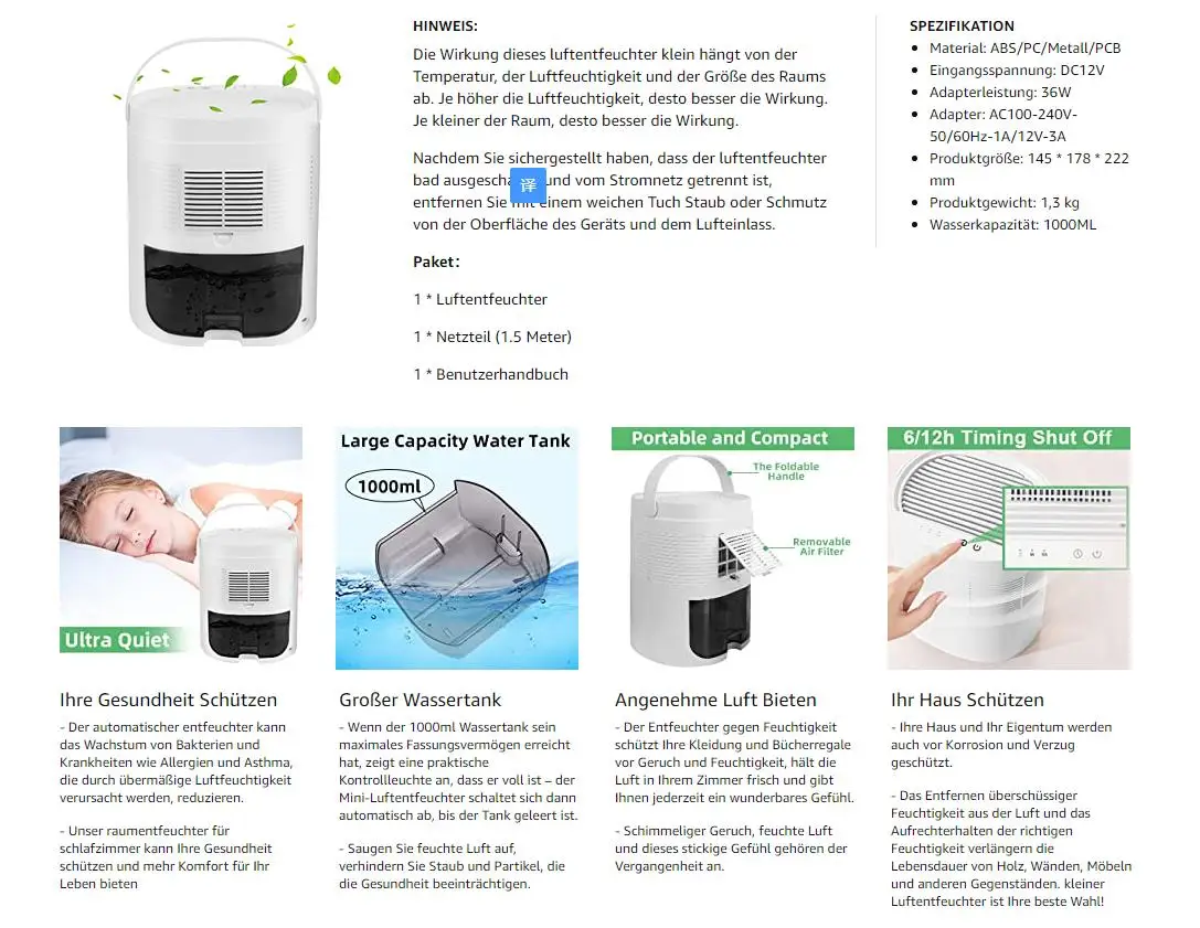 효율적이고 에너지 절약적인 제습기: 이 제습기는 반도체 응축 기술을 채택하여 24 시간 내에 최대 450 ml의 수분을 지능적이고 효율적으로 흡수합니다 (온도: 30 ℃, 습도: 80% RH). 매우 낮은 에너지 소비로 여분의 습도없이 편안한 환경을 즐기십시오.