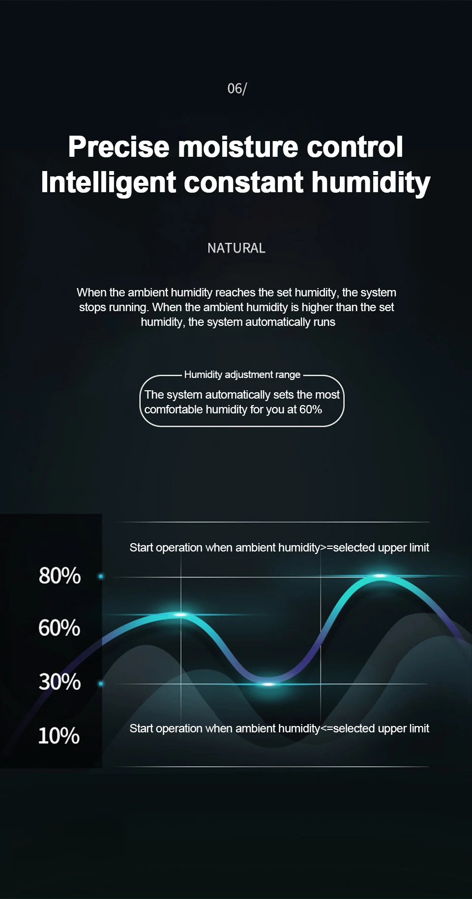 4. 정확한 습도 제어, 지능형 일정한 온도. 주변 습도가 설정 습도에 도달하면 시스템이 작동을 멈추고, 주변 습도가 설정 습도보다 높으면 시스템이 자동으로 실행됩니다.